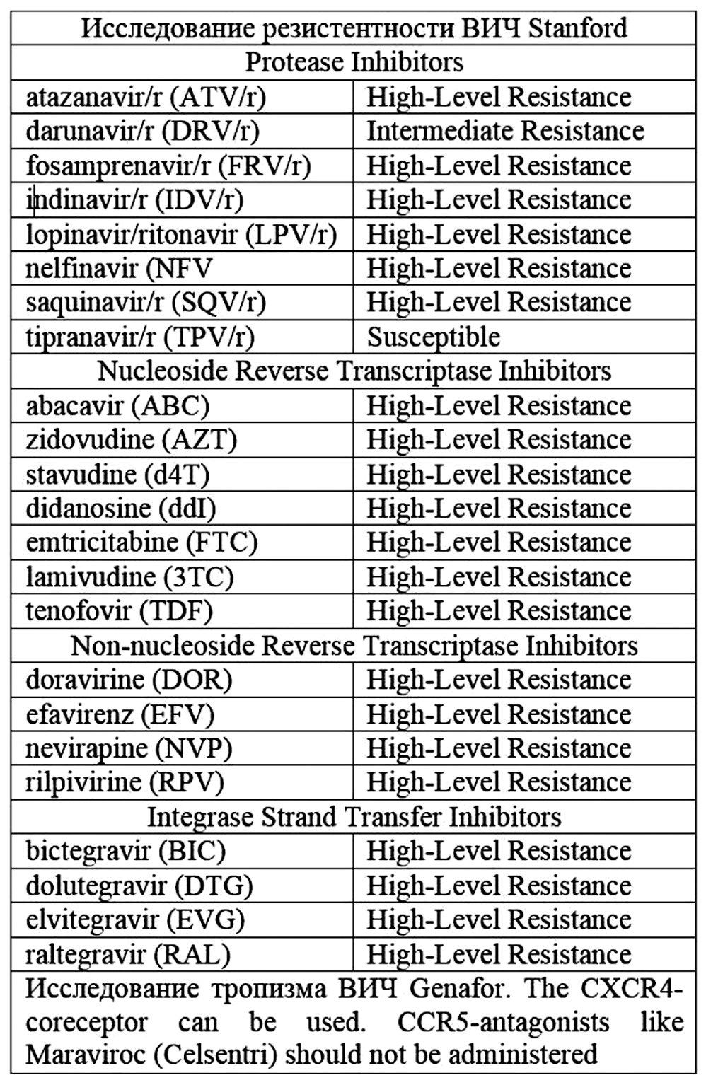 Из представленных данных видно, что в группе НИОТ выявлена высокая резистентность ВИЧ к Зальцитабину (ddC), ddI, d4T, AZT, Абакавиру (ABC), возможная — к Эмтрицитабину (FTC), 3TC, отсутствие резистентности к Тенофовиру (TDF); в группе ННИОТ выявлена высокая резистентность ВИЧ к Невирапину (NVP), Делавирдину (DLV), возможная — к Эфавирензу (EFV); в группе ИП — высокая резистентность к Фосампренавиру (FOS), NFV, LPV, Ритонавиру (RTV), Ампренавиру (APV), Саквинавиру (SQV), Индинавиру (IDV), Атазанавиру (ATV). На основании проведенного исследования были установлены причины неэффективности АРТ у ребёнка на протяжении 9 лет лечения: выявлена высокая резистентность ВИЧ к применяемым препаратам d4T, AZT, 3TC, NFV, LPV, RTV, также сформирована перекрёстная резистентность ВИЧ к препаратам, которые не входили в схемы лечения, что значительно сузило спектр выбора возможных АРВП.