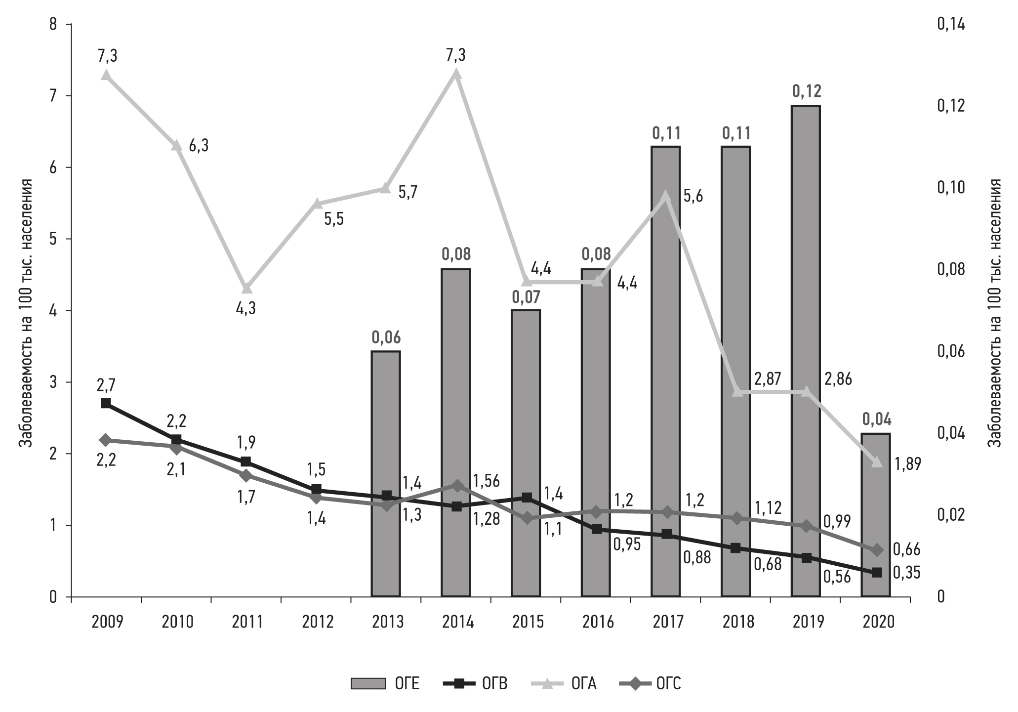 Note: ОГВ ― acute hepatitis B; ОГС ― acute hepatitis C; ГЕ ― hepatitis E; ГА ― hepatitis A.