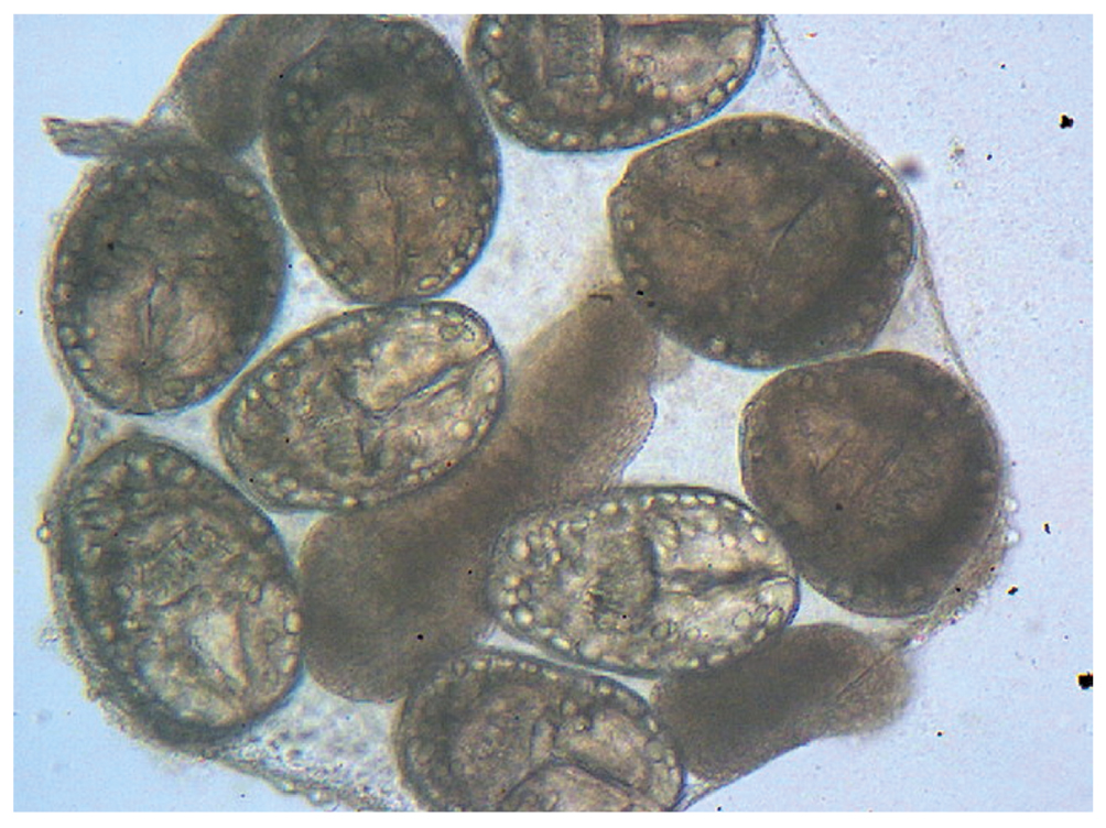 Рис. 1. Протосколексы эхинококка в выводковой капсуле. ×400.