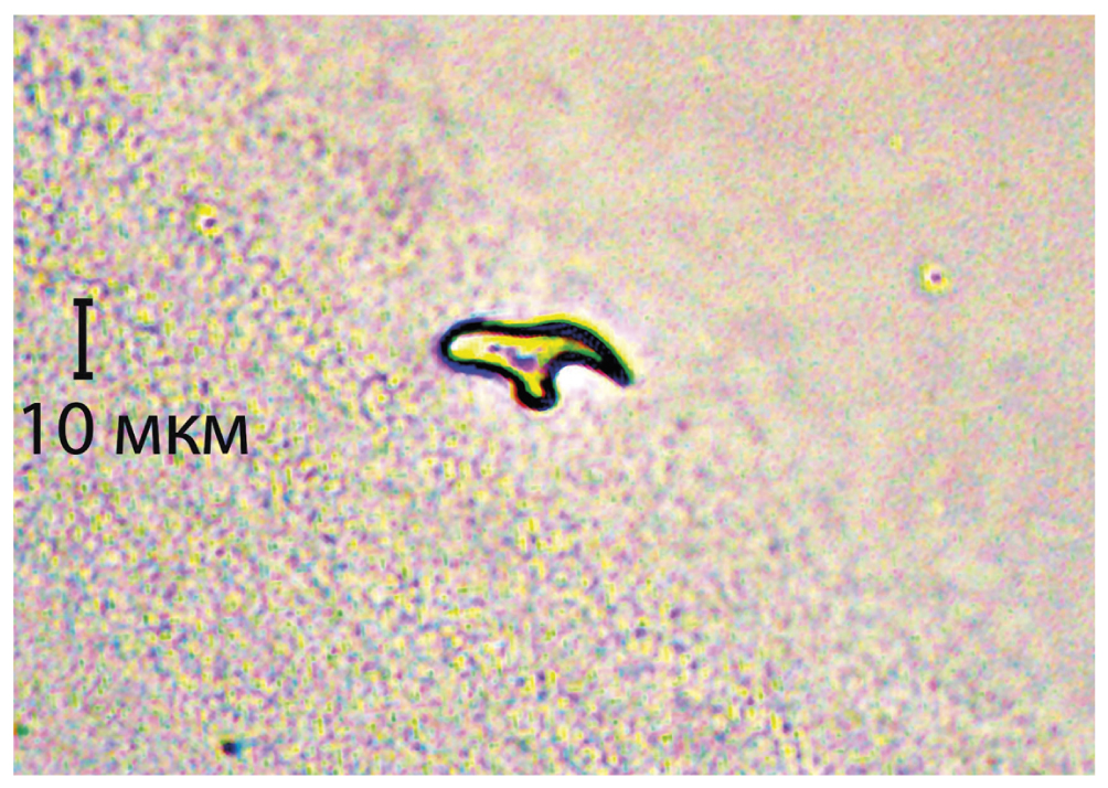 Результат считался положительным, если в препарате обнаруживались протосколексы Е. granulosus и (или) их фрагменты (крючья). Протосколексы обнаруживались в целых или разрушенных выводковых капсулах, а также отдельно лежащими (рис. 1). В некоторых пробах были обнаружены только единичные крючья этого паразита (рис. 2). Их специфическое строение и относительно крупные размеры (от 0,021 до 0,024 мм) позволяют достаточно легко идентифицировать их при микроскопии. Обнаруженный в единственном числе, этот элемент протосколекса, даже если в пробе отсутствуют другие морфологические признаки паразита, служит достоверным подтверждением диагноза «эхинококкоз» [2].