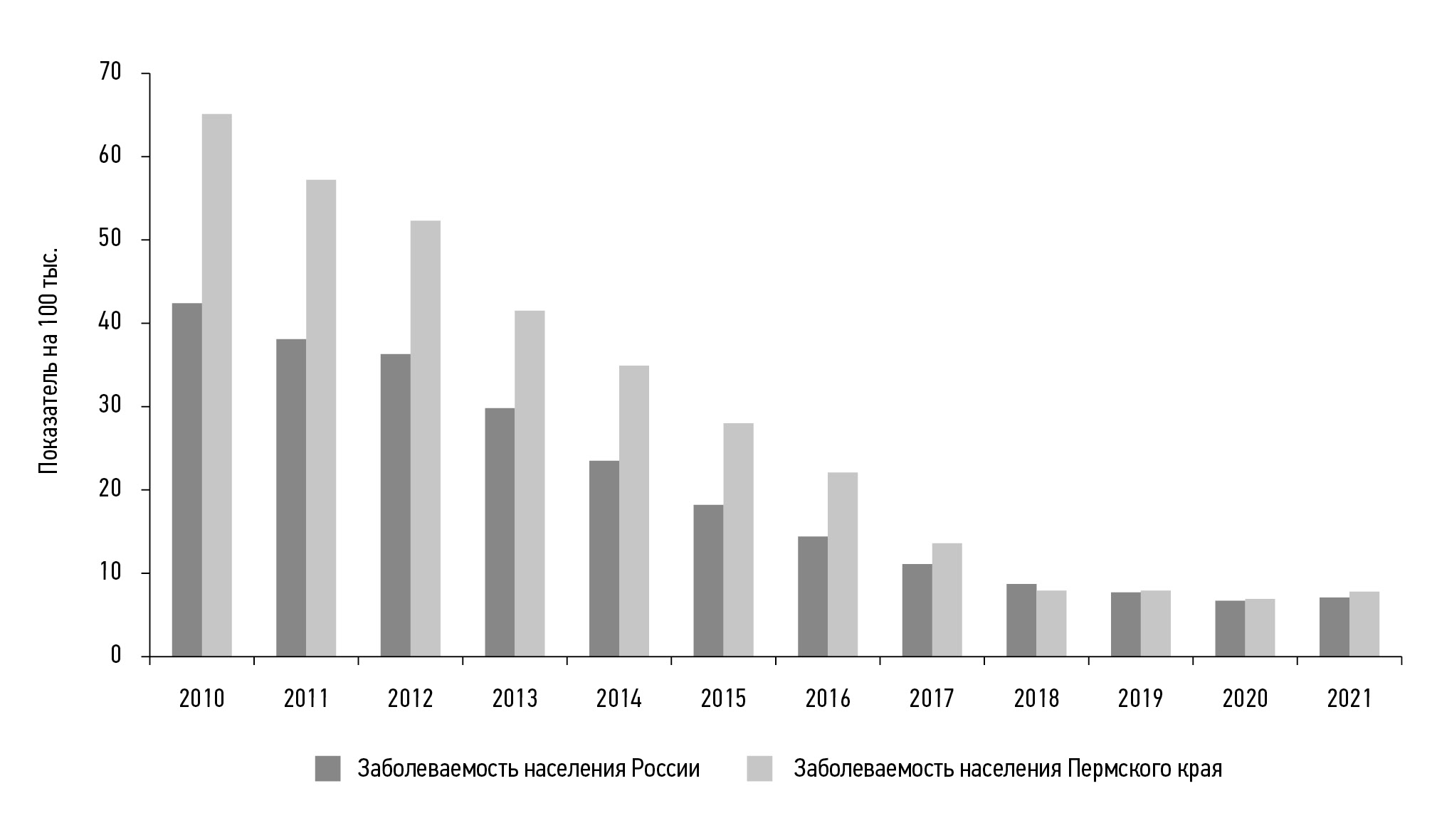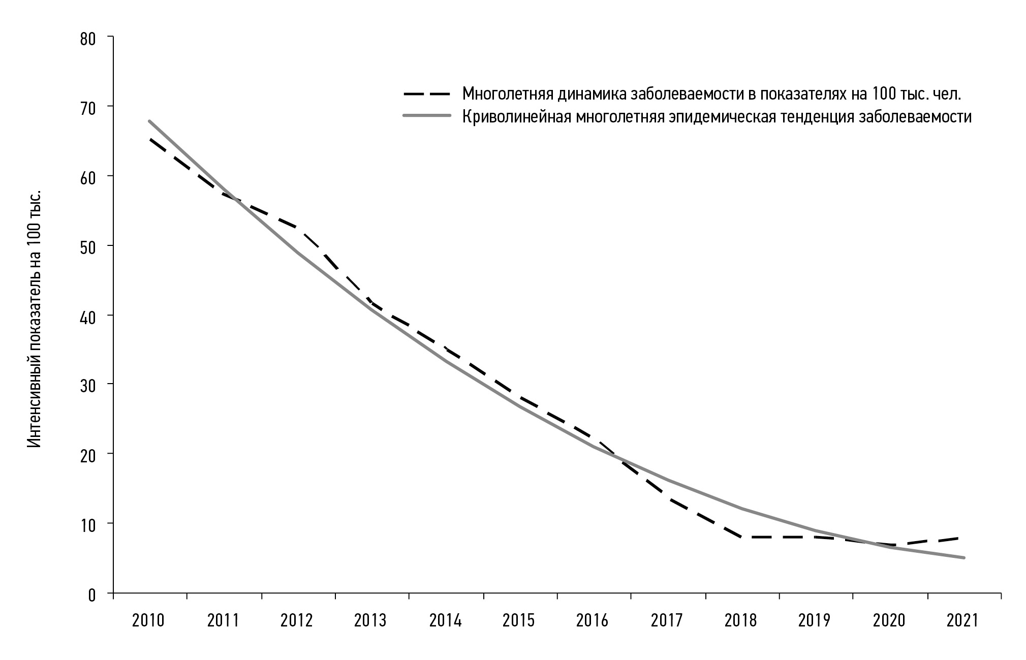 Многолетняя динамика заболеваемости ОГГИ среди населения Пермского края характеризовалась ярко выраженной тенденцией к снижению (рис. 2, 3). Среднегодовой темп прироста (снижения) составил –16,2%, что в соответствии с градацией В.Д. Белякова (1981) указывает на выраженную тенденцию заболеваемости. За период с 2010 по 2021 г. показатель заболеваемости снизился более чем в 8 раз и составил 7,8 на 100 тыс. человек (p <0,05).
