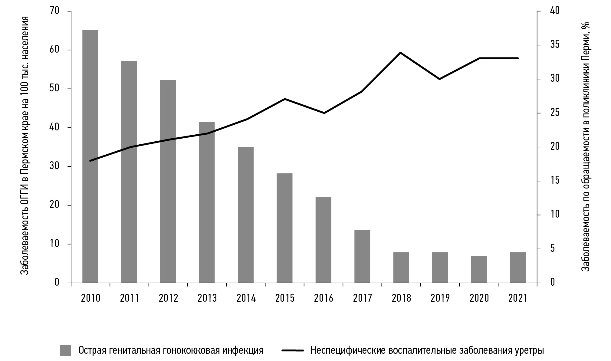 MATERIALS AND METHODS: A comparative retrospective analysis of the incidence of аcute genital gonococcal infection and urogenital tract nonspecific inflammatory diseases among patients of the Perm Region was performed using the annually published data of official statistics. The data on the incidence of genital tract nonspecific inflammatory diseases were obtained from outpatient patient records of three clinics in the city of Perm. Epidemiological and statistical information processing methods were used in the work, and the Pearson coefficient was used for correlation analysis.
