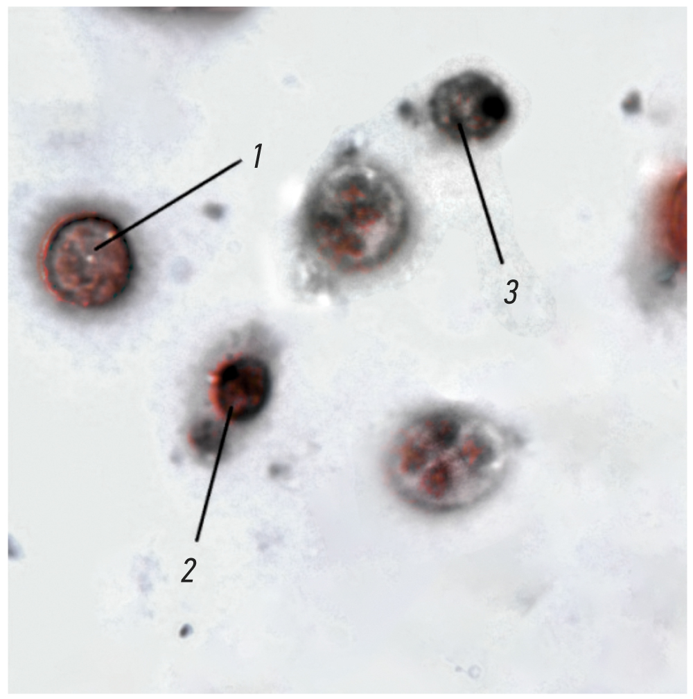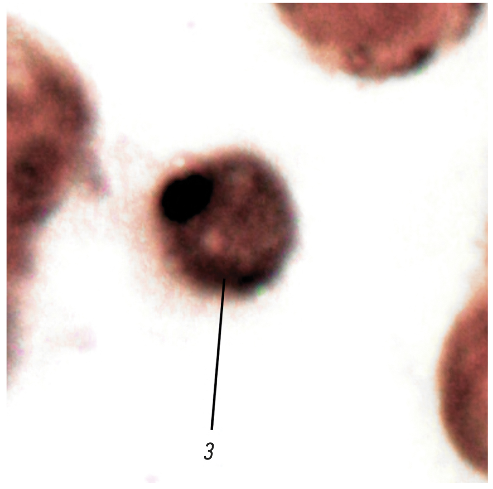 2. Fig. 1. Lymphocytes with varying degrees of nonspecific α-naphthyl acetate esterase activity in ixodid tick-borne borreliosis. Staining of the nuclei with Carazzi’s hematoxylin: 1 — I degree in the form of dusty granularity; 2 — II degree, the presence of several clear granules in the cytoplasm; 3 — III degree, one large stain of the dye. ×100.