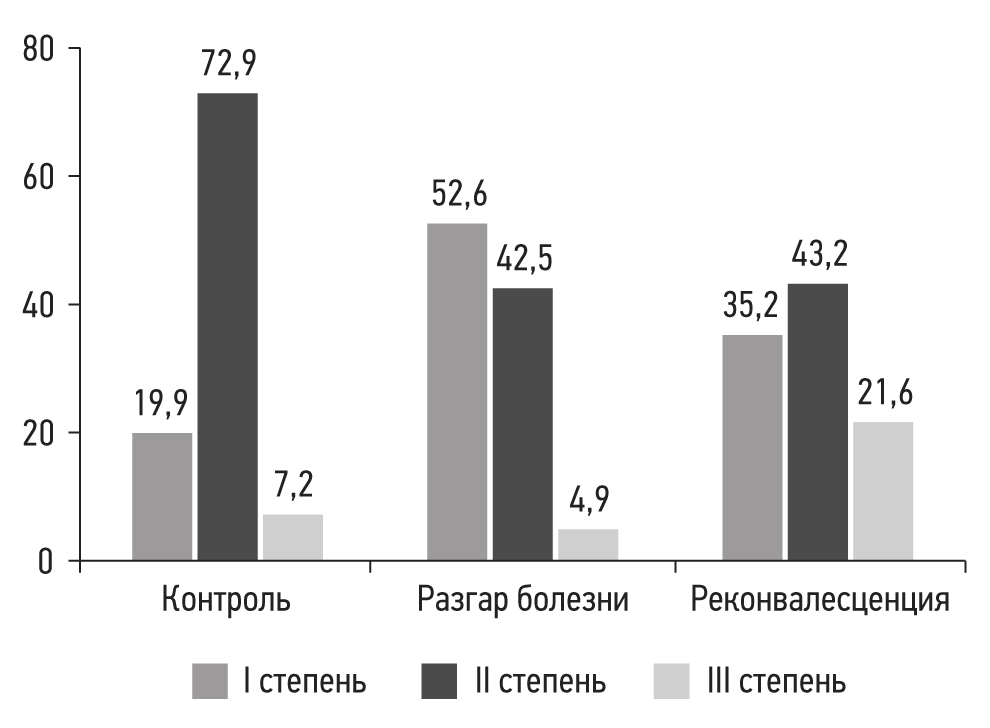 Полученные результаты обрабатывали статистически с использованием программы STATISTICA 6.1. Вычисляли среднюю арифметическую вариационного ряда (М), ошибку средней арифметической (m). Для оценки достоверности различий сравниваемых показателей пользовались t-критерием Стьюдента, различия считались достоверными при р <0,05. Оценку связи между клиническими симптомами и лабораторными показателями проводили по методу четырёх полей путём вычисления коэффициента ассоциации (Q). Связь между признаками (показателями) при Q от 0 до 0,29 расценивали как слабую, от 0,3 до 0,69 — умеренную, от 0,7 до 1,0 — сильную.