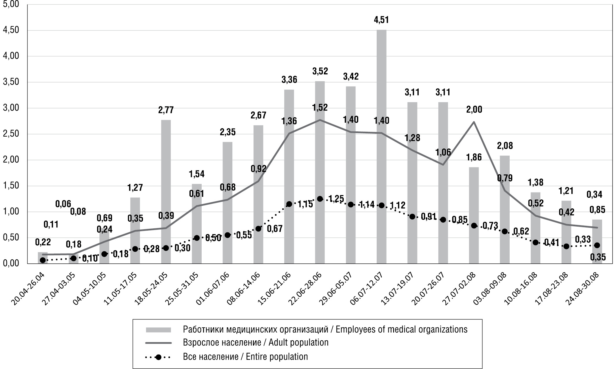 В период с 17-й по 18-ю неделю 2020 г. заболеваемость COVID-19 среди работников медицинских организаций регистрировали в виде единичных случаев, и она не превышала показатель 0,22‰. Начиная с 19-й по 28-ю неделю календарного года заболеваемость медицинских работников имела средний темп прироста 13,7% и достигла своего наиболее высокого уровня ― 4,51‰. С 29-й по 35-ю неделю наблюдали снижение заболеваемости до 0,85‰ (рис. 1).