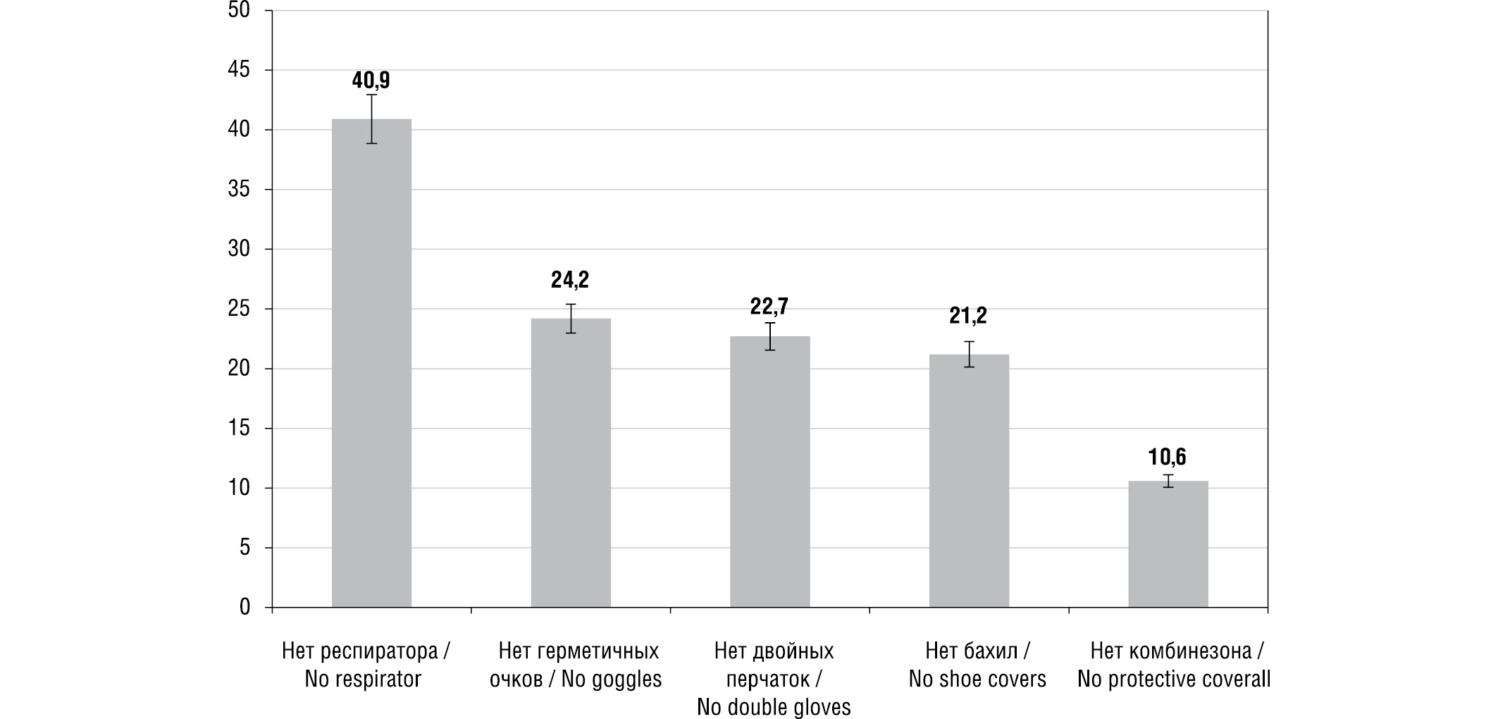 Полностью рекомендации по комплектации СИЗ соблюдали сотрудники инфекционных, провизорных, обсервационных госпиталей. При оказании скорой медицинской помощи соответствие рекомендациям не превышало 77,8%, в поликлиниках ― 52,6%, стационарах для неинфекционных пациентов ― 62,5%, в других подразделениях ― 77,8%. Наиболее частым нарушением было отсутствие респиратора (FFP3 или FFP25) ― 40,9%. Комбинезон или противочумный халат не использовали в 10,6% случаев, плотно прилегающие очки ― в 24,2%, двойные перчатки ― в 22,7%, бахилы ― в 21,2% (рис. 2). В 16,7% случаев имело место отсутствие одной, в 6,1% — двух или трёх, а в 18,2% — четырёх комплектующих в СИЗ.
