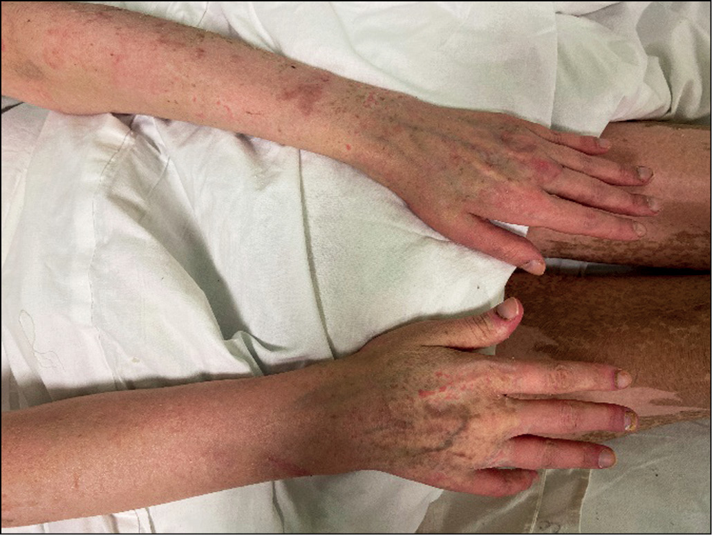 Объективно при поступлении в отделение интенсивной терапии. Состояние тяжёлое. Сознание ясное; ориентирована верно, всесторонне; адекватна. Жалобы на слабость, боль во всём теле, высыпания по всей площади кожного покрова, сухость во рту, слезотечение, боль в глазах. Цвет кожных покровов гиперемирован. Влажность кожи повышена. Тургор сохранён. Отёки отсутствуют. Слизистая оболочка ротоглотки гиперемирована, отёчна. На слизистой оболочке щёк, мягкого нёба множественные афты. Сливная гиперемия на коже лица, туловища и конечностей. Множество булл, часть из которых вскрывшиеся, изменения более выражены на нижних конечностях (рис. 1, 2). В лёгких аускультативно дыхание жёсткое, проводится во все отделы, хрипов нет. Частота дыхания 20/мин. SpO2 96%. Тоны сердца ритмичные, звучные. Артериальное давление 110/70 мм рт.ст. Пульс соответствует частоте сердечных сокращений ― 96/мин. Язык влажный, обложен белым налётом. Живот при пальпации мягкий, безболезненный. Перитонеальных знаков нет. Перистальтика выслушивается, активная. Симптом поколачивания отрицательный с двух сторон. Мочеиспускание по катетеру, диурез не снижен, моча жёлтого цвета.