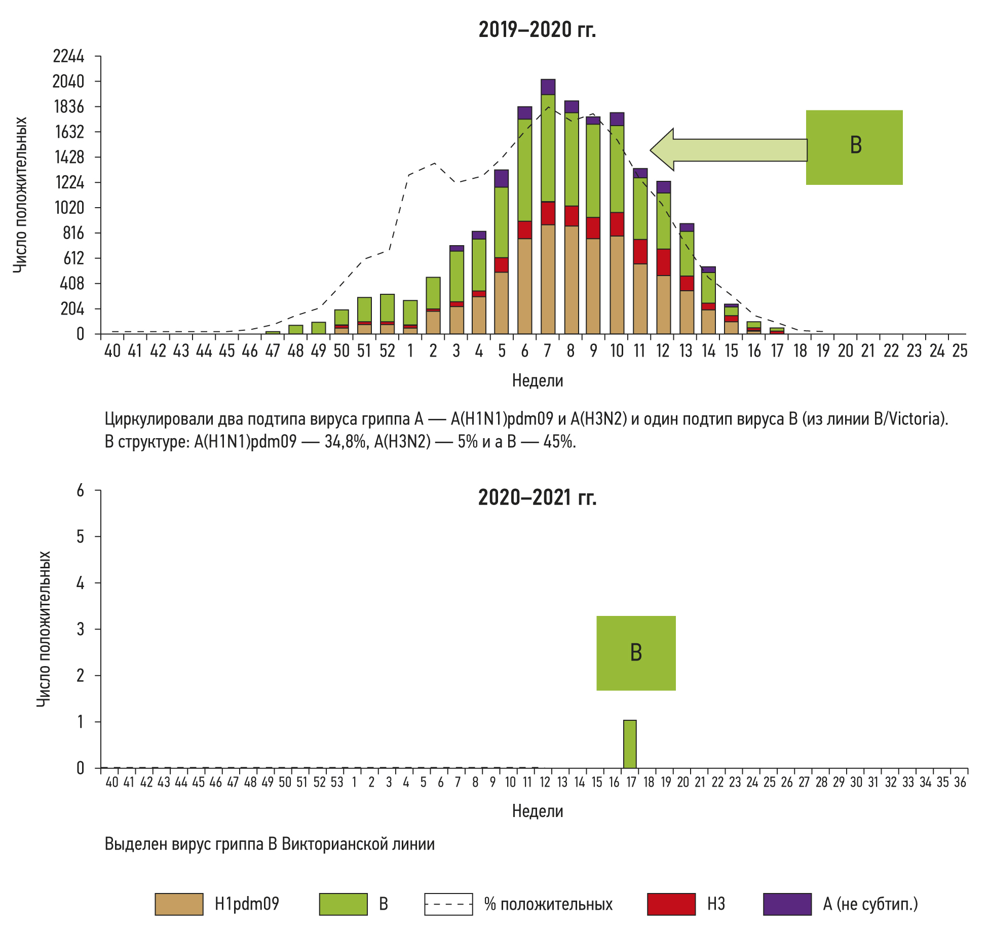 В сезон 2020–2021 годов ни один из подтипов не получил широкого распространения. В мире были зарегистрированы единичные случаи лабораторно подтверждённого гриппа. Вирусы гриппа практически исчезли из человеческой популяции. В России выделить и антигенно охарактеризовать удалось лишь два вируса В Викторианской линии (рис. 1).