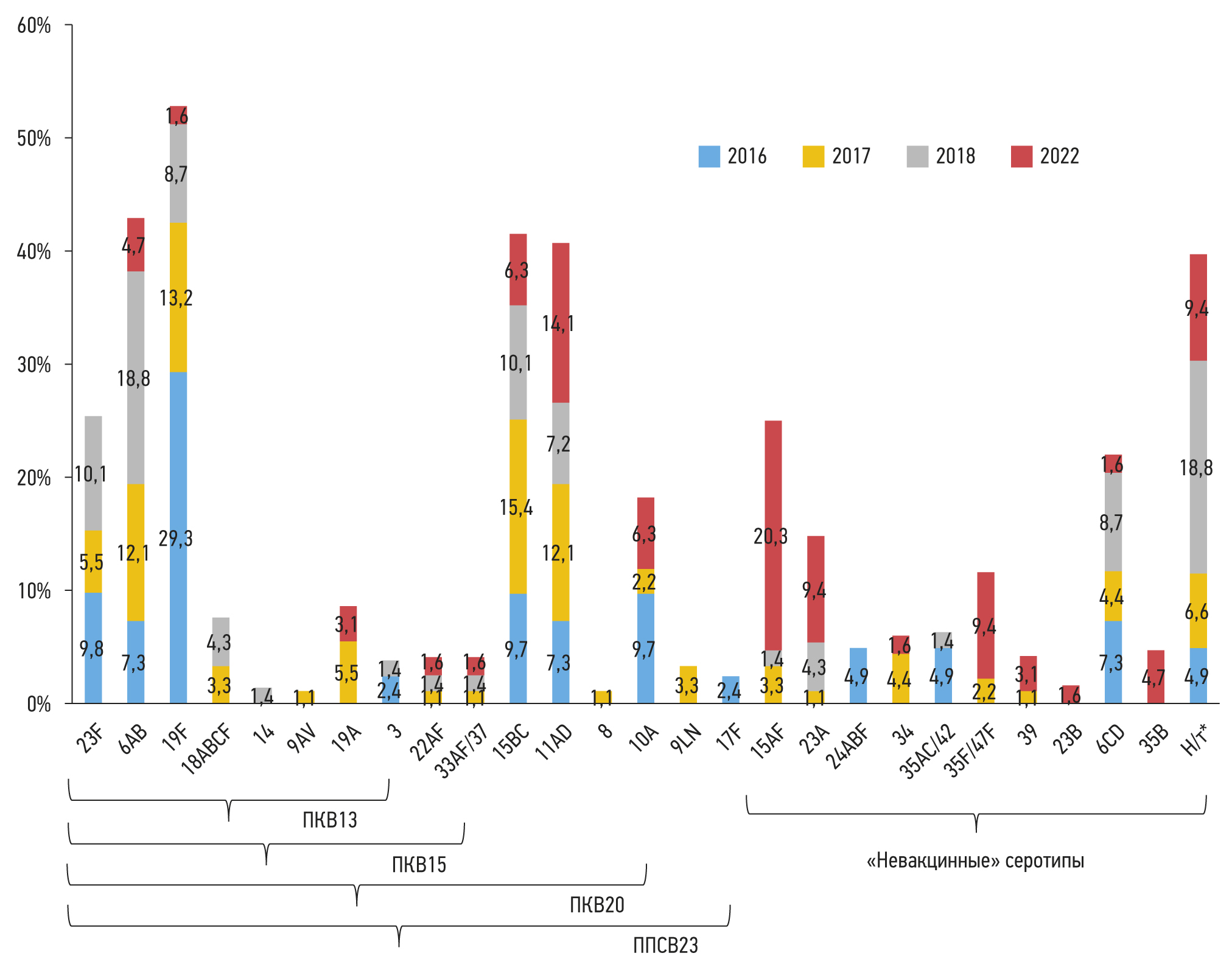 2. Fig. 1. Dynamics of Streptococcus pneumoniae serotype distribution in healthy preschool children in 2016–2022. *Н/т — strains which serotype has not been determined (not included in the standard serotyping scheme).