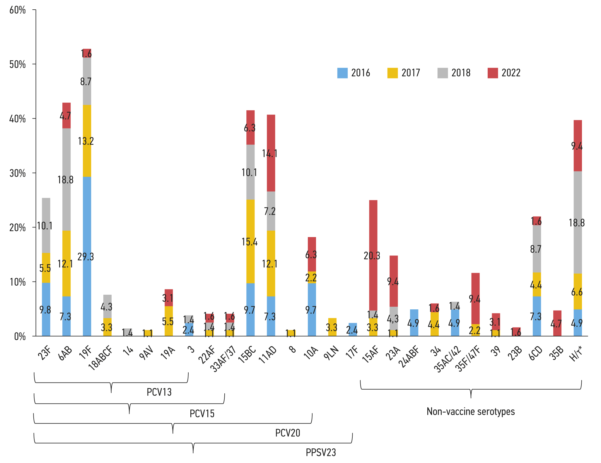 Analysis of compliance of circulating S. pneumoniae serotypes with the antigen composition of pneumococcal vaccines showed that in 2022, only 9.4% of isolated cultures belonged to the serotypes included in PCV13, used for routine immunization of infants and toddlers (Table 2). Additionally, a progressive reduction in serotype overlap between PCV20 and PPSV23 (the 23-valent pneumococcal polysaccharide vaccine recommended for children over 2 years of age and adults) was observed, accompanied by a simultaneous increase in the proportion of S. pneumoniae variants not included in available vaccines, commonly referred to as “non-vaccine” (see Table 2).