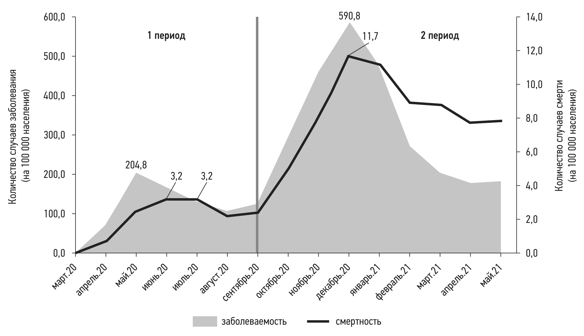 The second period of morbidity rise and decline lasted for 9 months (September 2020–May 2021). The rise in morbidity was recorded from September to December 2020 and the decline from January to April 2021. In May 2021, a slight increase was noted in morbidity (+2.5%); however, no significant differences were found between the incidence rates in April and May 2021 (p ≥0.05). The maximum incidence rate during the second period of the rise and fall of incidence was 590.8 cases per 100,000 population (December 2020), whereas the minimum was 123.8 cases per 100,000 population (September 2020). Concurrently, the month with the highest mortality rate coincided with the month with the highest incidence rate (December 2020), with a mortality rate of 11.7 cases per 100,000 population. The lowest mortality rate was observed in October 2020 (5.0 cases per 100,000 population).