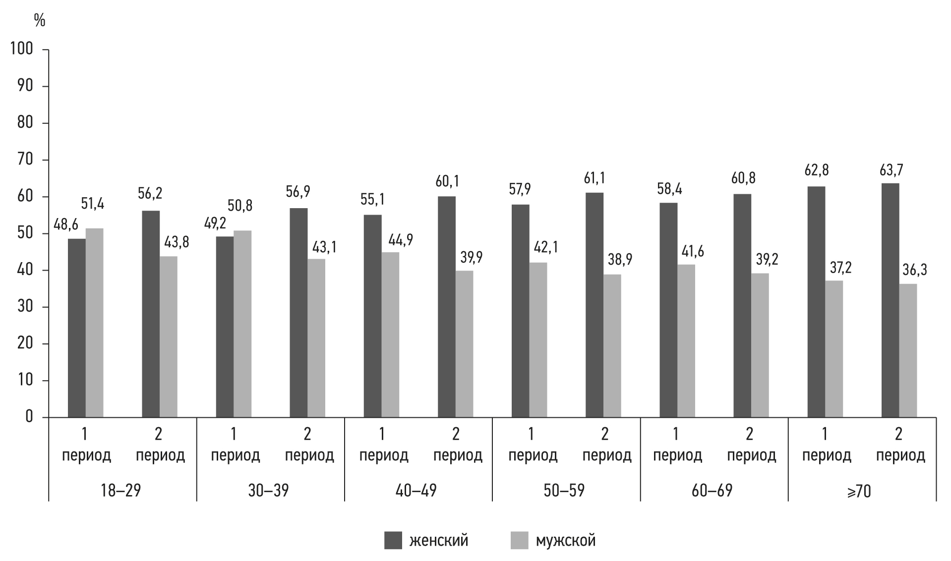 Fig. 2. Age and sex structure of patients with COVID-19 in the first and second waves of COVID-19 in Russia (chi-squared test, р <0.05).