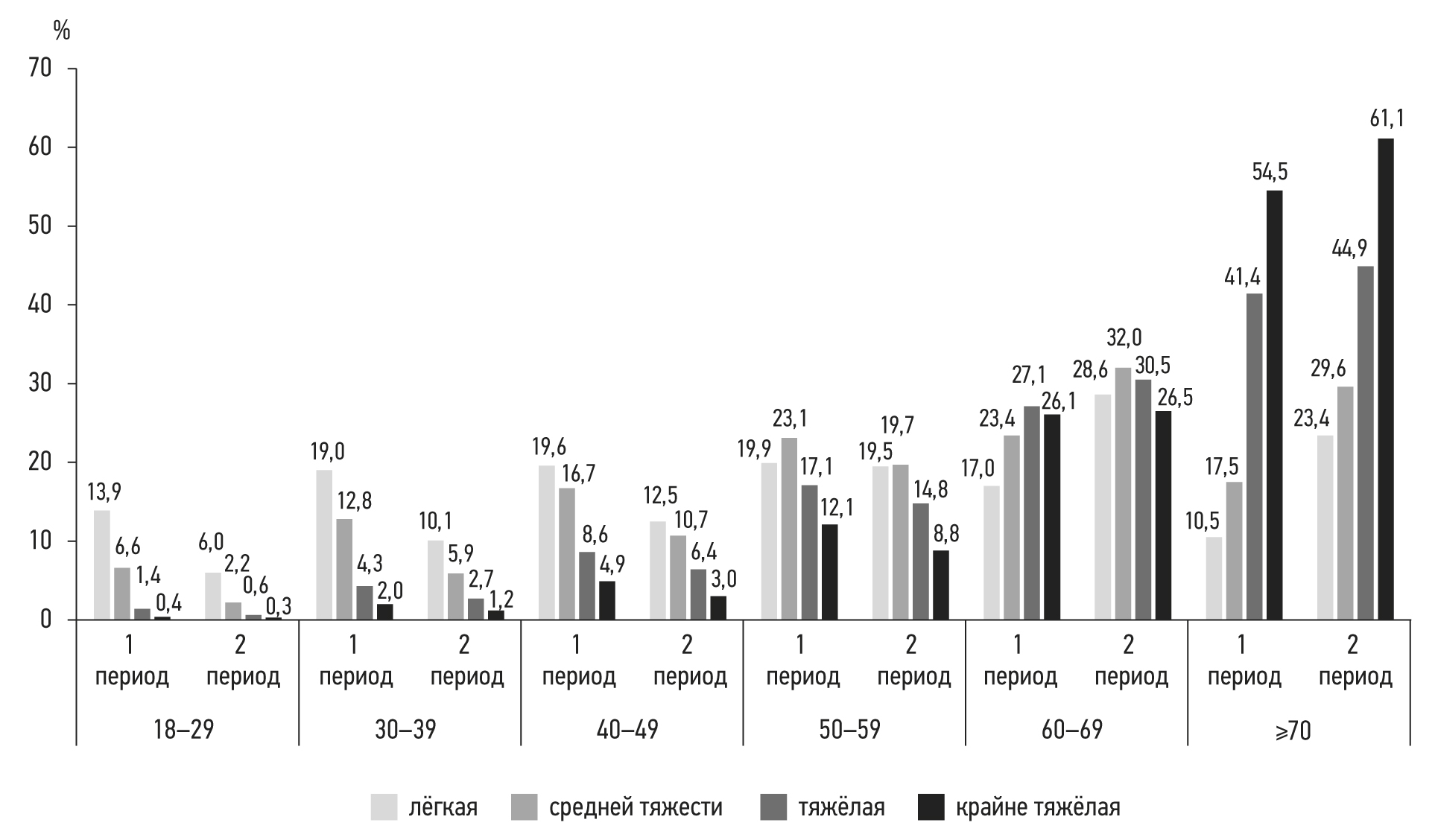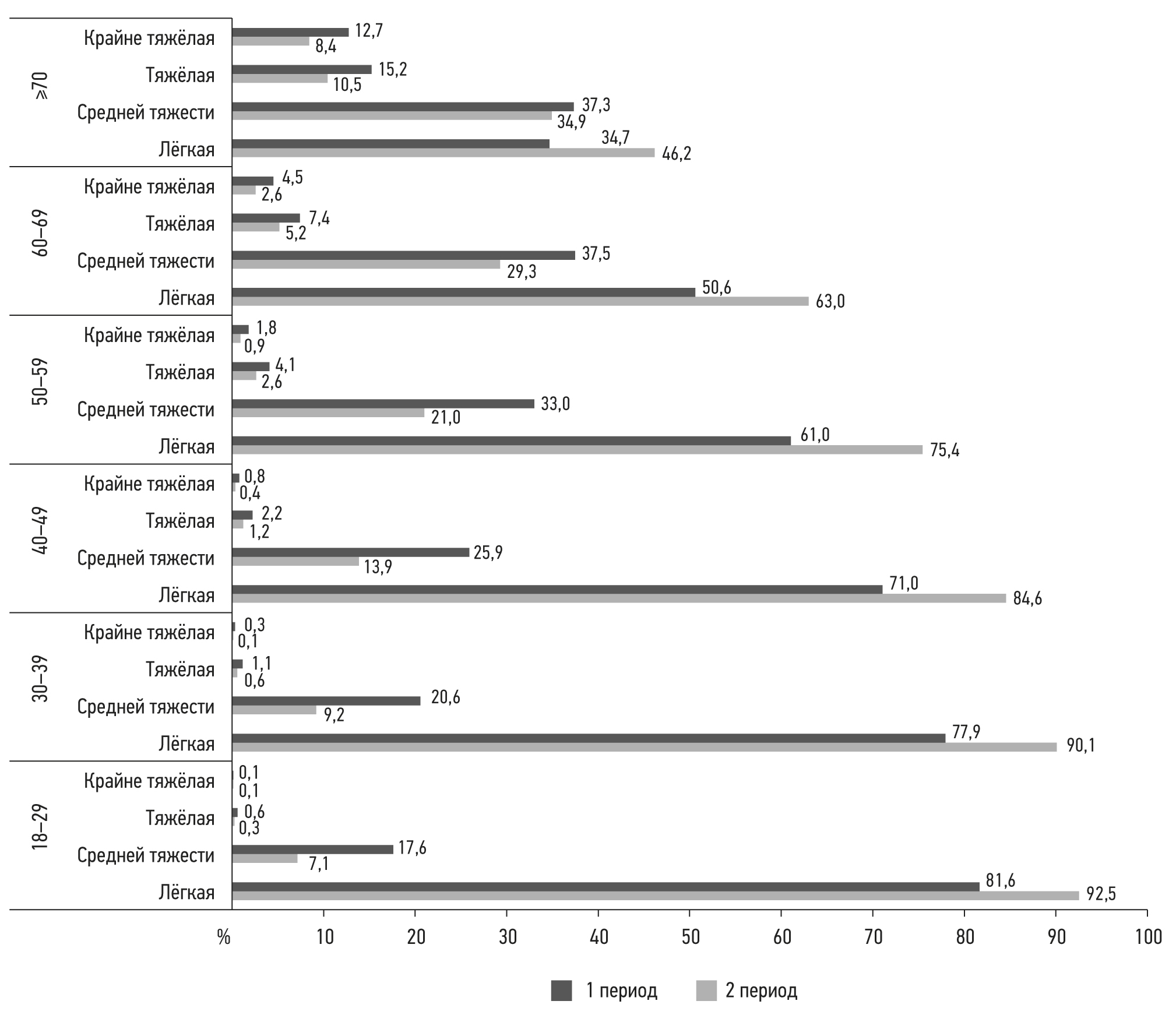 Fig. 4. COVID-19 severity in various age groups of hospitalized patients during the first and second waves of COVID-19 in Russia (chi-squared test, р <0.05).