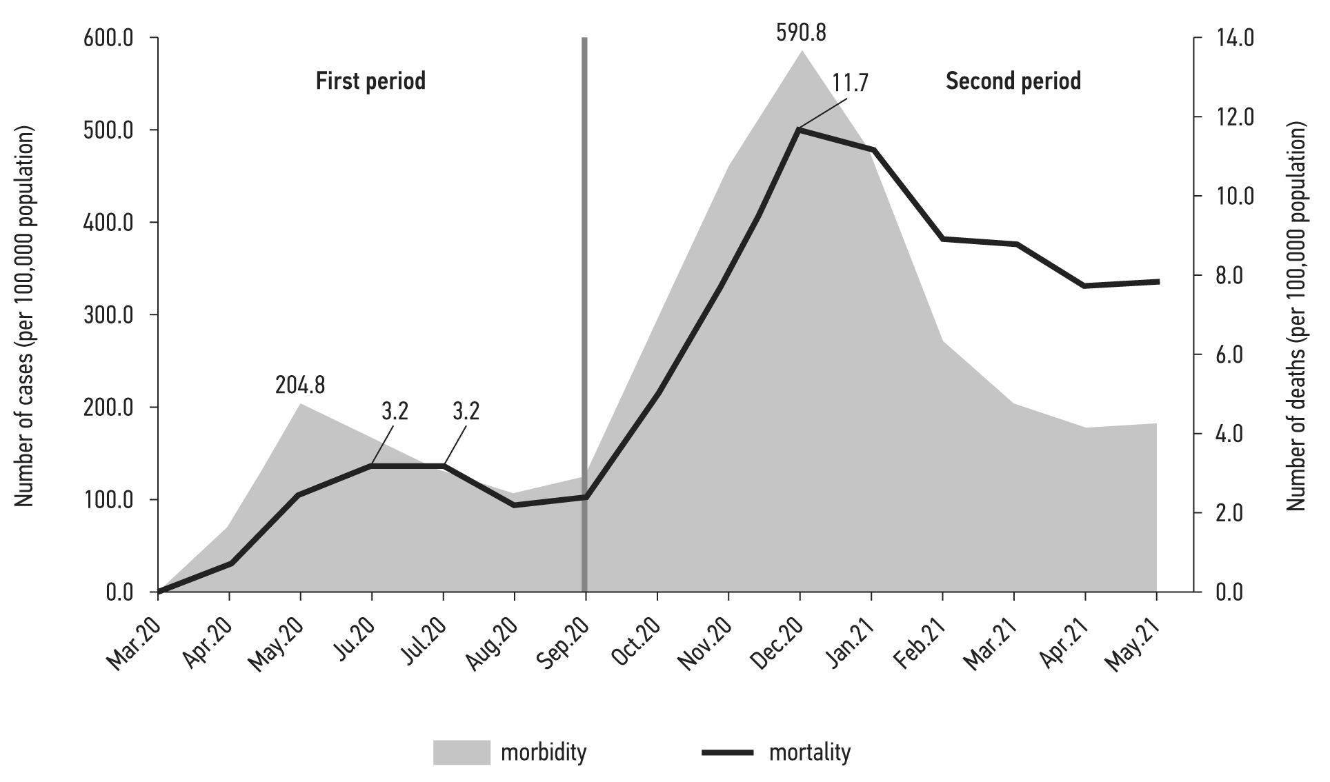 The initial period encompassed a 6-month duration (March–August 2020). During this period, the morbidity rate exhibited a fluctuating pattern, with an increase observed from March to April 2020 and a subsequent decline from June to August 2020. The maximum value of the incidence rate in this period was 204.8 cases per 100,000 population (May 2020), whereas the minimum value was 1.6 cases per 100,000 population (March 2020). In this period, the maximum values of the mortality rate were recorded subsequent to the peak of the incidence rate, occurring in June and July 2020 (3.2 cases per 100,000 population).