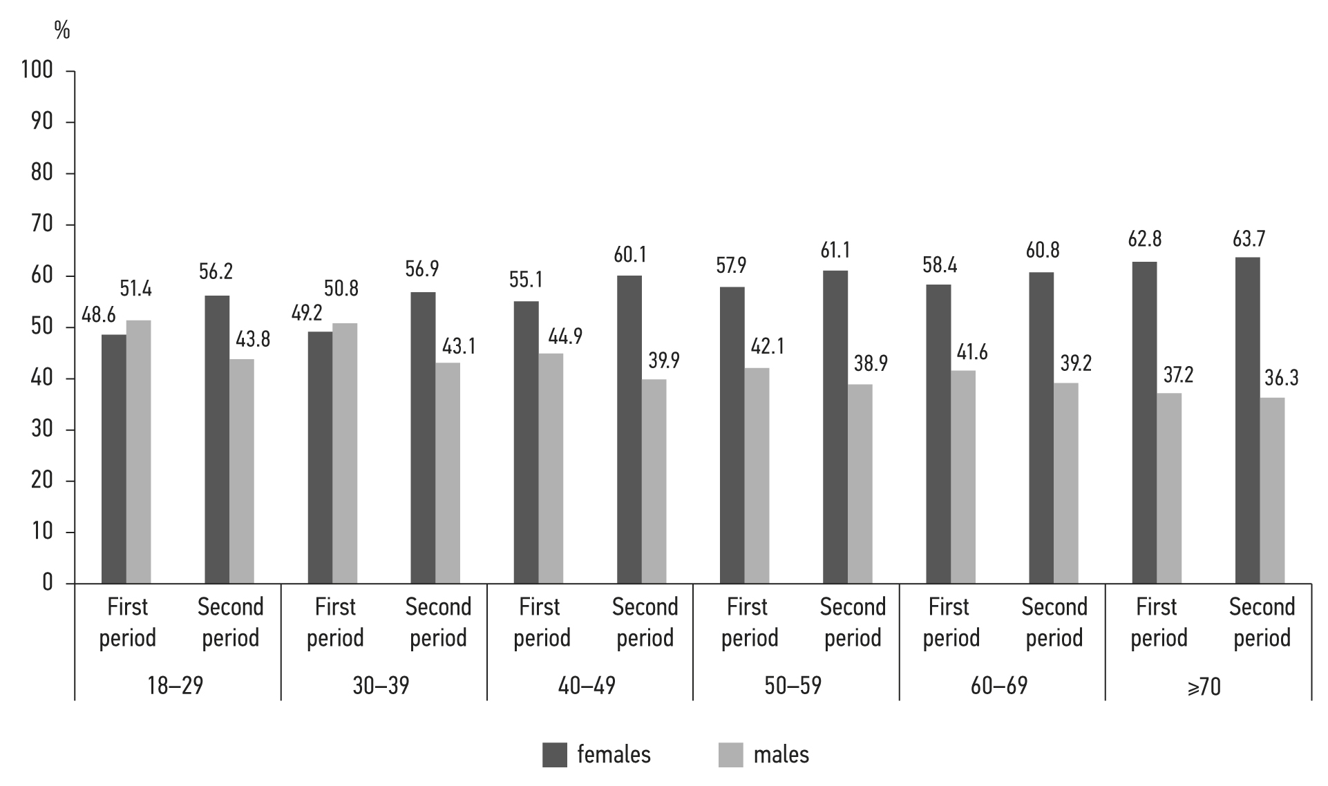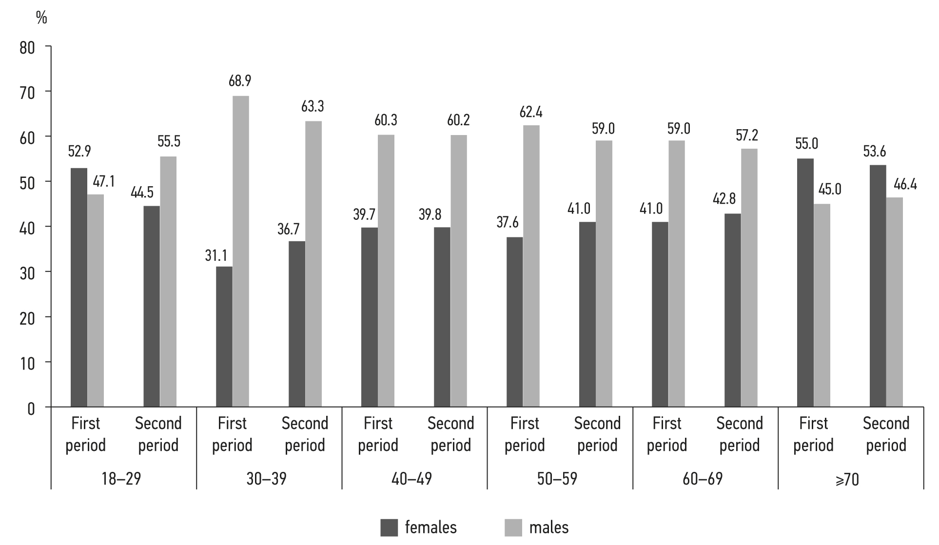 Upon analysis of the sex distribution of patients, the most pronounced differences were observed in the age group >70 years (p <0.05) (Fig. 2).