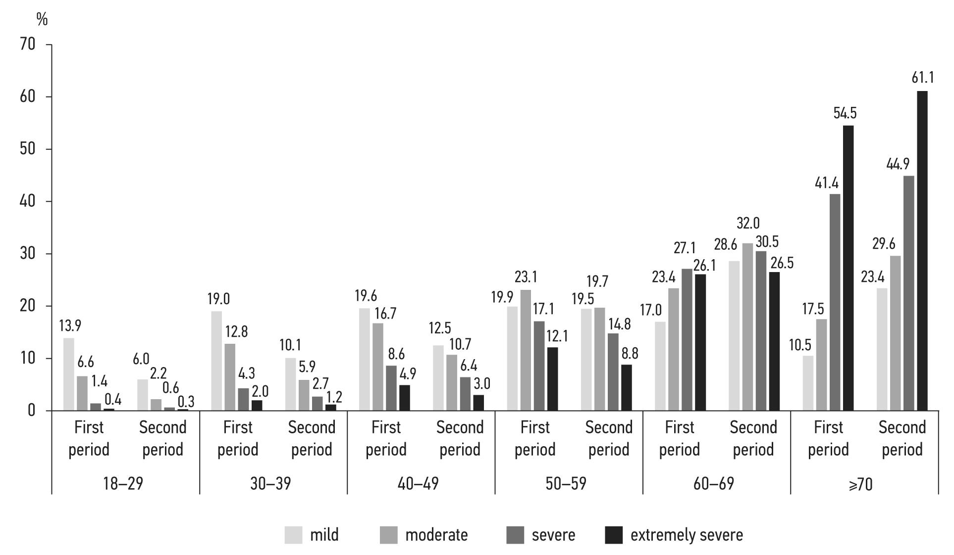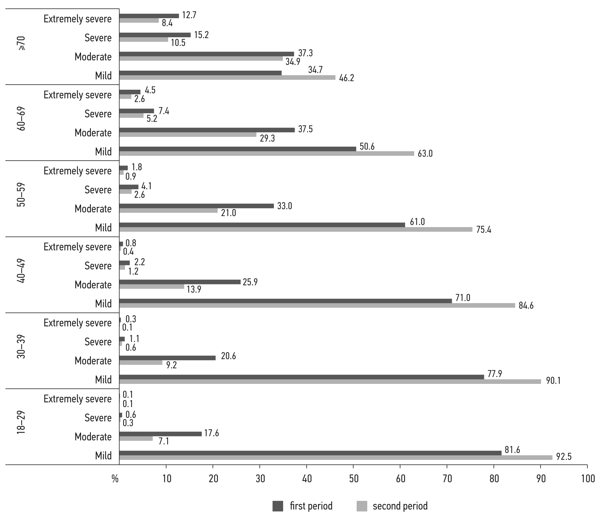 Majority (63.0%) of patients exhibited mild severity of the disease. In the youngest age group (18–29 years), the proportion of patients with mild forms of the disease was 81.6%, and 0.1% of patients in this age group experienced an extremely severe form of COVID-19. However, in older age groups, an increase was observed in the frequency of severe and extremely severe courses of the disease (Fig. 3). The frequency of extremely severe disease was higher in male (3.5%) than in female (2.7%) patients (p <0.05).