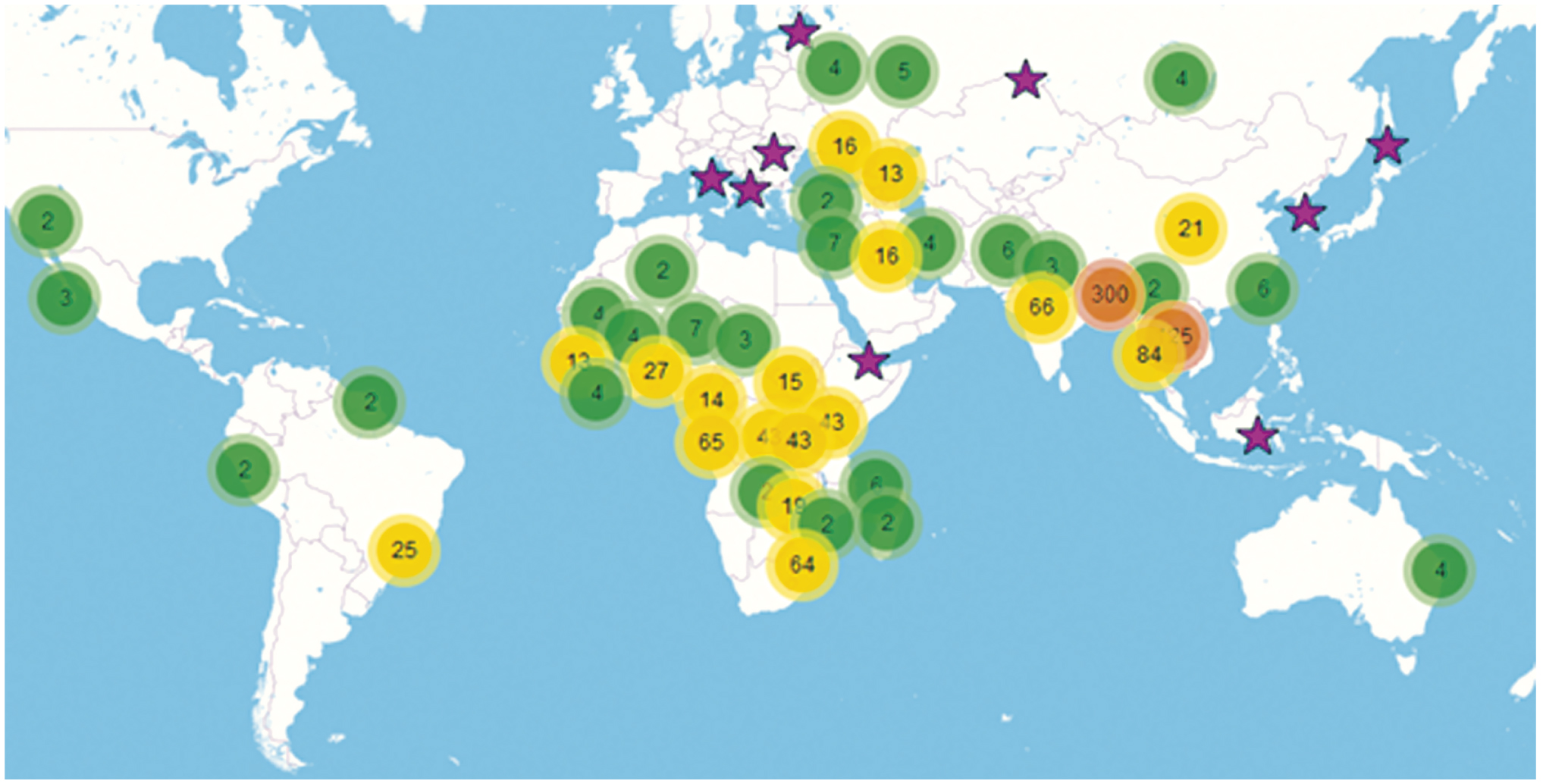 Fig. 1. Appearance of the geographic information system “INDEL genotypes of V. cholerae O1 strains”. The result of a query on the geographical distribution of strains of the major INDEL cluster A is presented. The circles show the places where the strains were isolated, the number in the circle corresponds to the number of isolated strains. The color of the marker and its shape reflect the number of isolated cultures: single strains — with an star; from 2 to 10 — green circle; from 10 to 100 — yellow circle, over 100 — orange circle.