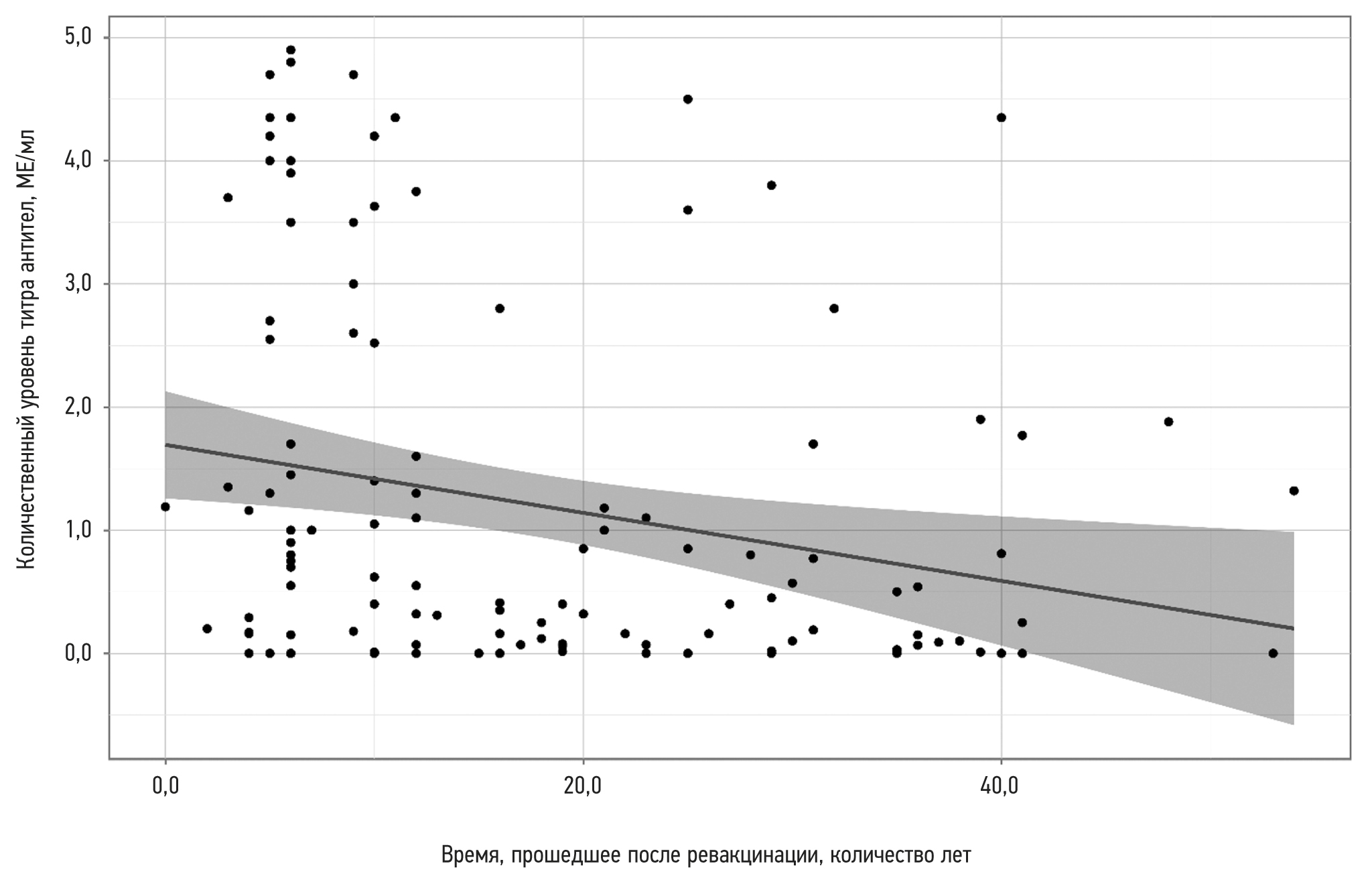 Materials and methods: An observational, single-center, cross-sectional, uncontrolled study was conducted. Inclusion criteria: employment in a healthcare organization; age over 18 years; documented history of vaccination and revaccination with a live measles vaccine completed at least three weeks before blood sampling, or unknown vaccination and post-infection status; absence of infectious disease symptoms at the time of blood sampling. The study was conducted over one month in 2024. Venous blood samples were collected, and measles virus-specific IgG antibodies (IU/ml) were determined in the serum using an enzyme-linked immunosorbent assay kit Vector-Best (Novosibirsk, Russia). The quantitative level of class G (IgG) antibodies to the measles virus was assessed. Statistical analysis was performed using StatTech v.4.1.9 software (developed by Stattech LLC, Russia).