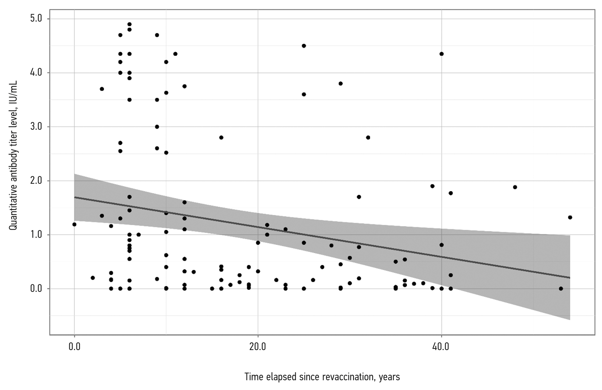 Results: The median age of vaccinated participants (n=133) was 48 years (Q1–Q3: 41–54, max 76). In 66% of cases (88/133), antibody titers were at a protective level, with a mean antibody titer of 0.62 IU/ml (Q1–Q3: 0.07–2.52, max 5.0 IU/ml). During the evaluation of the relationship between antibody titers and the time since revaccination at the time of titer measurement, an inverse, weak correlation was observed. The mean age of individuals with unknown vaccination and post-infection history (n=40) was 63.3±6.25 years (95% CI: 61.3–65.3), with a mean antibody level of 2.17 IU/ml (95% CI: 1.47–2.81).