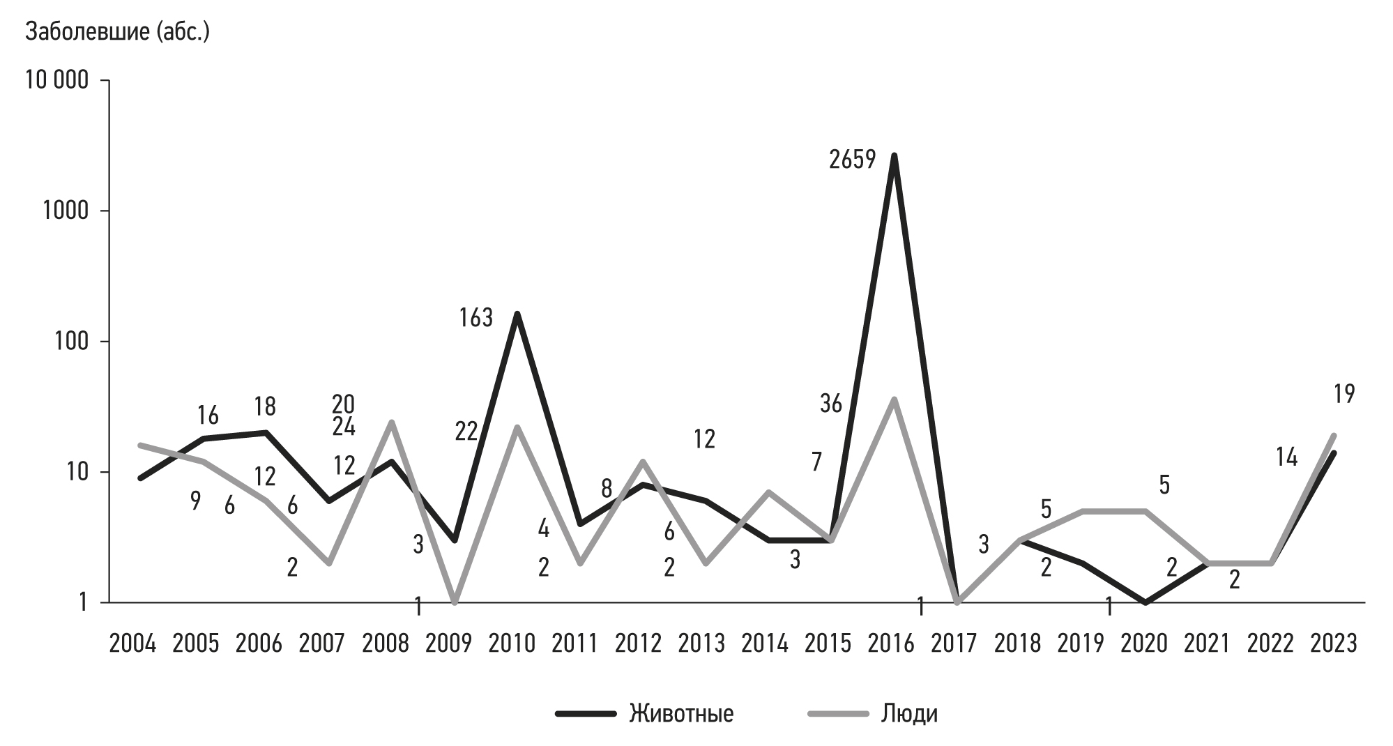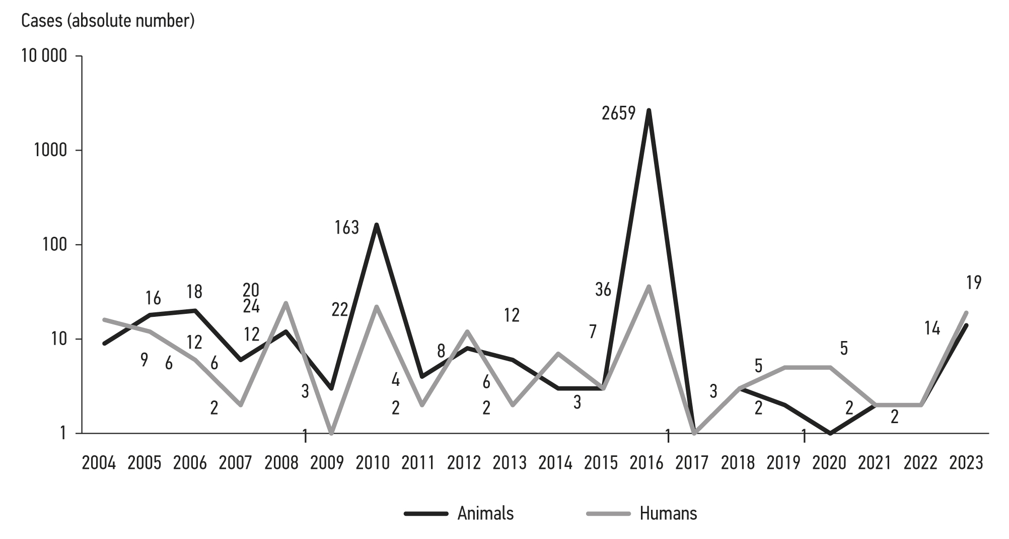 Fig. 1. Anthrax incidence trends in animals and humans in Russia, 2004–2023.