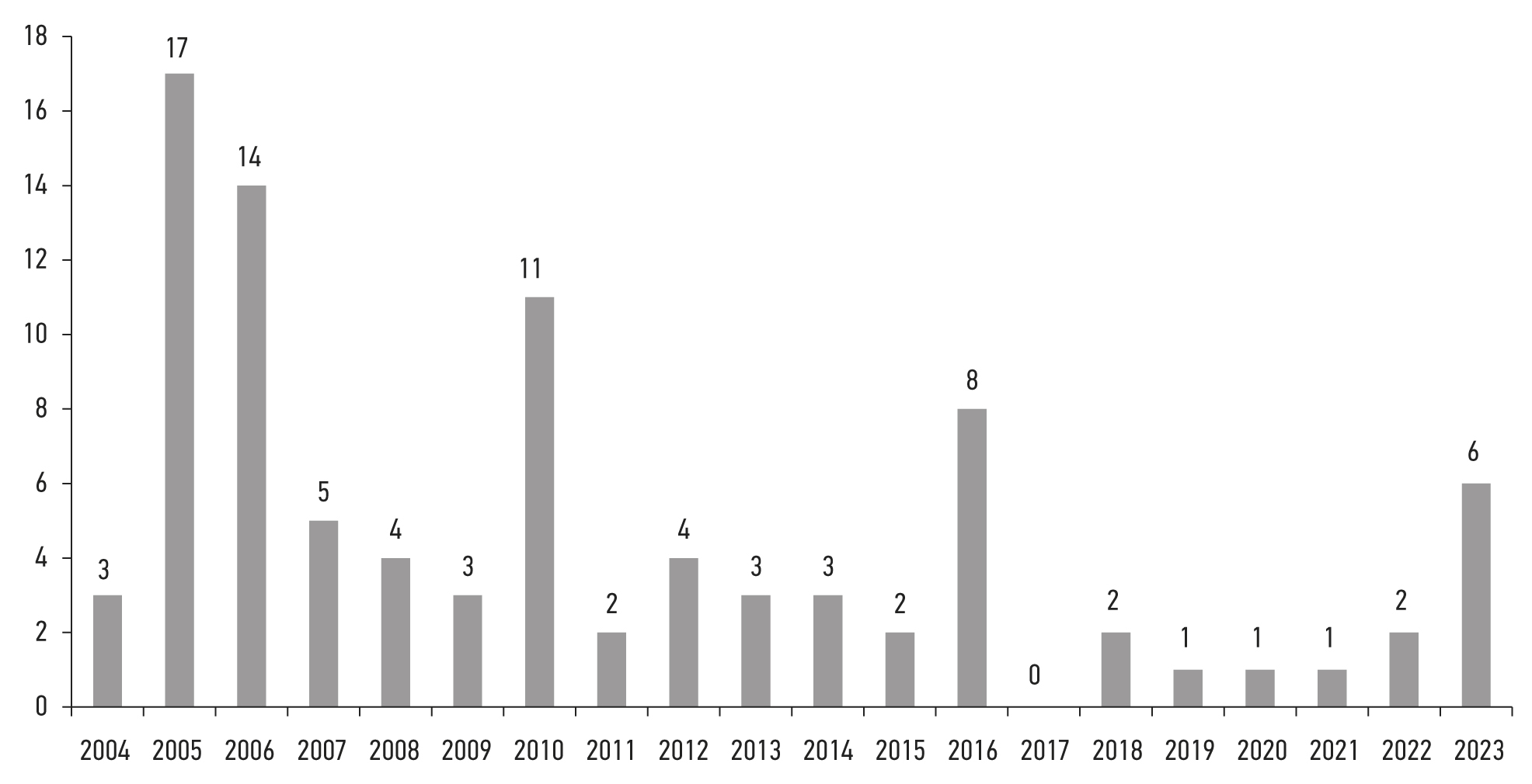 Fig. 2. Anthrax incidence trends in Russia, 2004–2023.