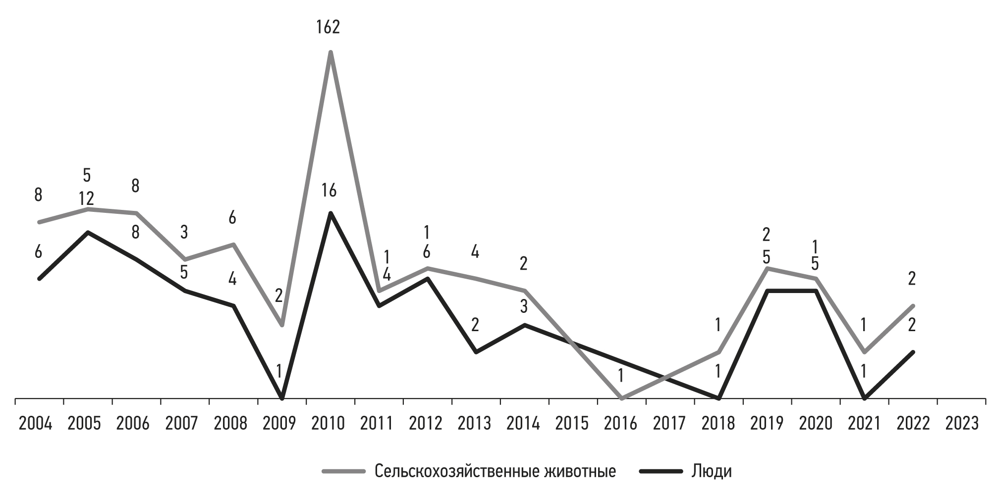 Between 2004 and 2023, 81 human cases of anthrax and 210 cases in farm animals were reported (Fig. 3). The main source of infection for humans was unvaccinated cattle, as well as small ruminants and pigs. Epidemiological investigations revealed that all infections were associated with violations of basic sanitary standards and inadequate oversight by regulatory authorities. Human contact with infected animals (either through animal care or processing of animal products) resulted in contact transmission of the causative agent. All reported patients had the cutaneous form of anthrax. Secondary sepsis and anthrax meningitis led to 4 fatal outcomes (Republic of North Ossetia–Alania: 2 cases in 2006 and 1 in 2007; Republic of Kalmykia: 1 case in 2004), representing 50% of all anthrax-related deaths [15].