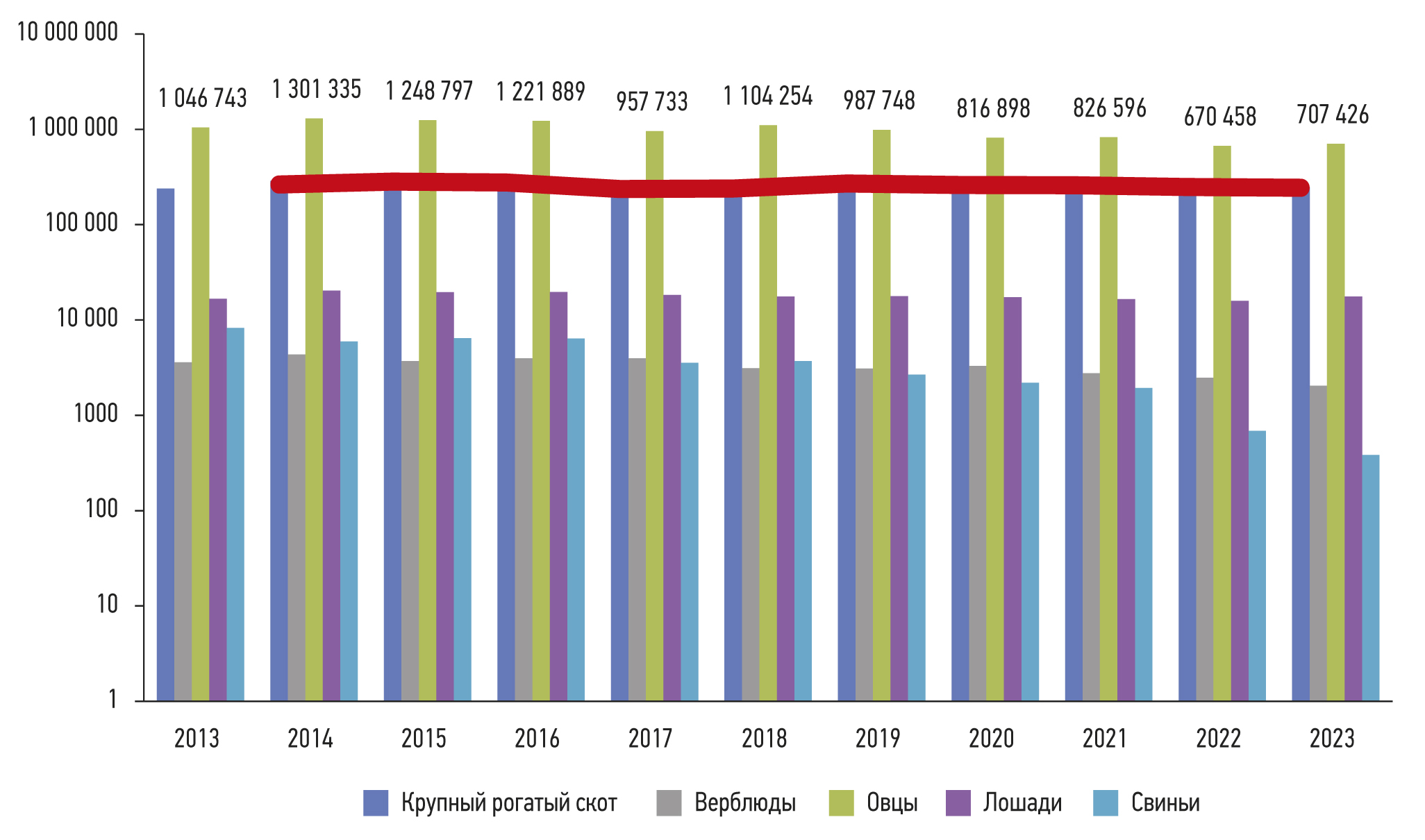 Active vaccination of domestic and farm livestock, conducted since the mid-20th century, has significantly reduced the number of anthrax outbreaks. In 2023, vaccination coverage was as follows: 83.2% of cattle, 53.8% of small livestock, 41.1% of horses, 58.3% of camels, and 48% of pigs. As shown in Fig. 4, the relative proportion of vaccinated farm animals has remained stable from 2014 to 2023, despite scheduled slaughter and natural herd attrition. No cases of anthrax in animals were reported during this period [18].