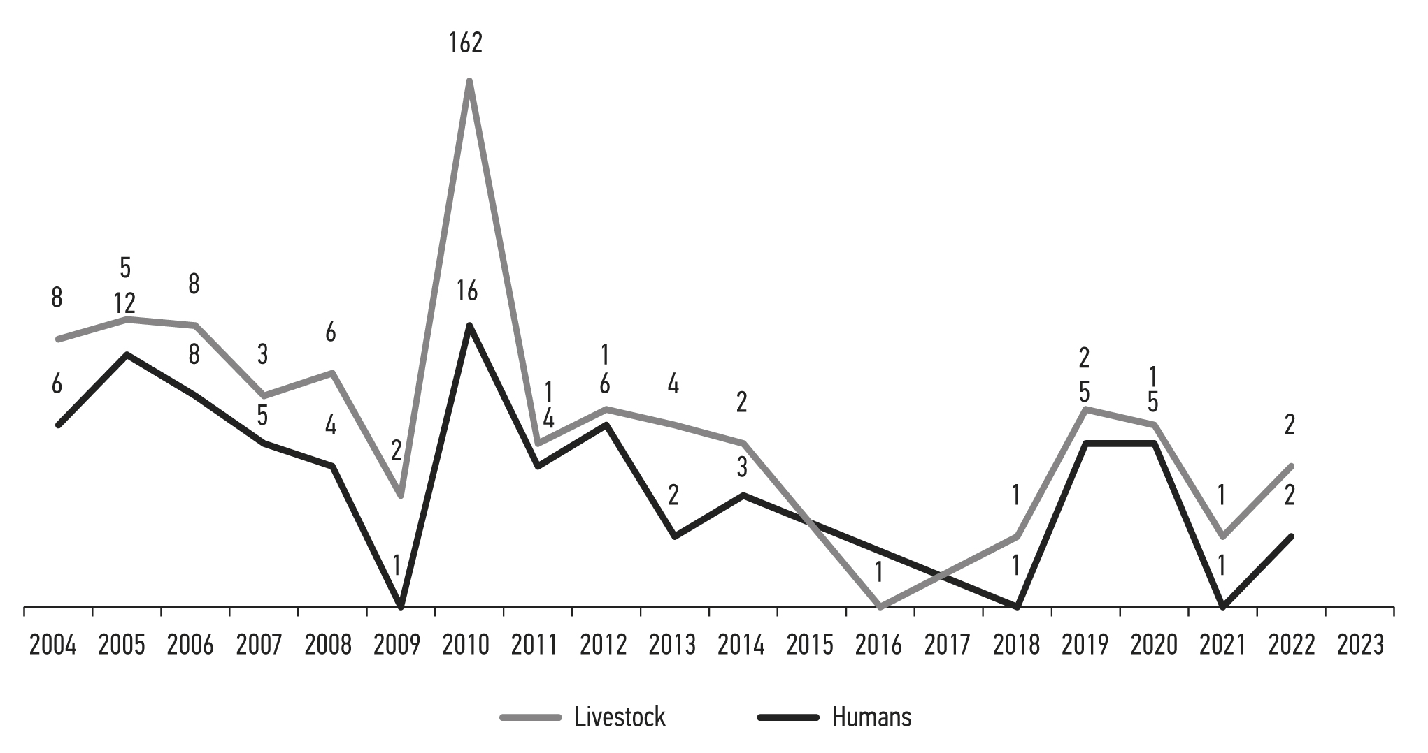 Fig. 3. Anthrax incidence trends in humans and livestock in Southern Russia, 2004–2023.