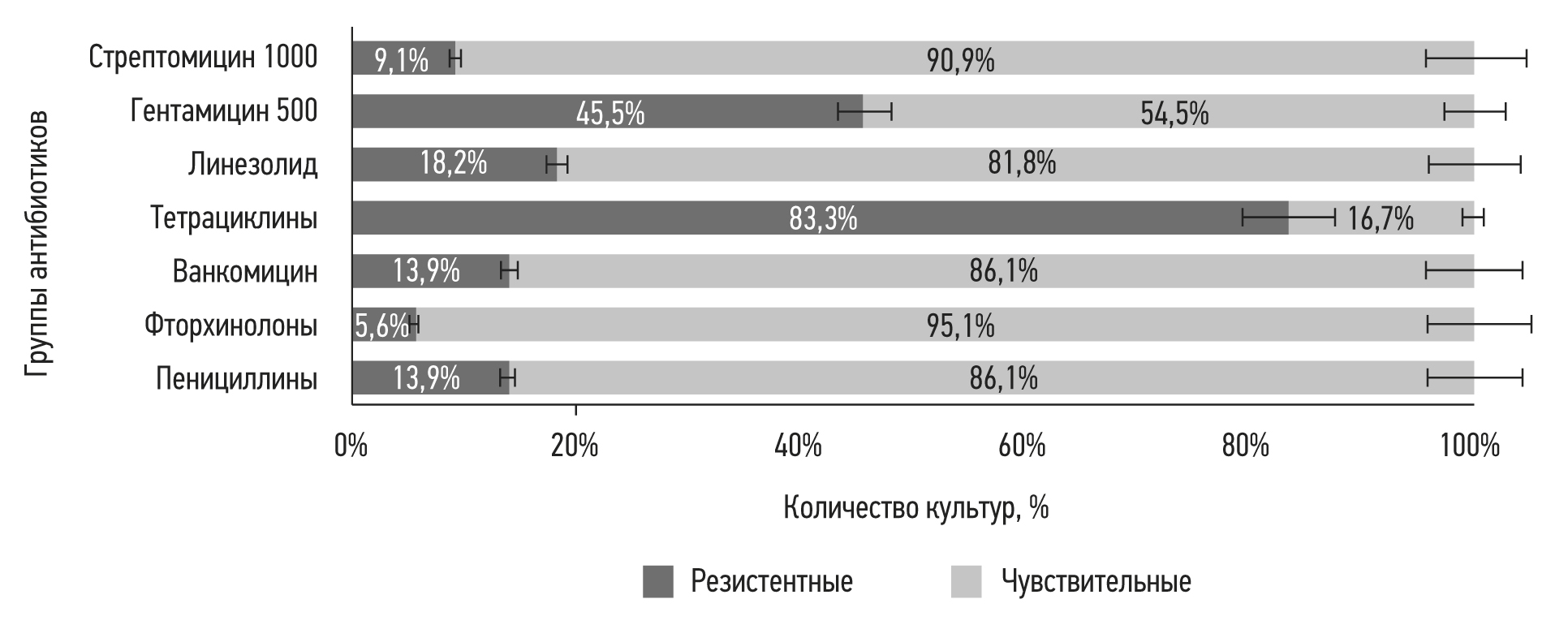 Использование аминогликозидов для лечения инфекций, вызванных E. faecalis, ограниченно при монотерапии из-за наличия механизмов, формирующих резистентность в отношении этой группы антибиотиков. Применение аминогликозидов высокой нагрузки (гентамицин 500, стрептомицин 1000) в диагностике позволяет выявить у E. faecalis наличие модифицирующих аминогликозиды ферментов, препятствующих положительному результату подавления роста при использовании этой группы антибиотиков в синергии с пенициллинами или гликопептидами [40]. Результаты нашего исследования демонстрируют, что 45,5% изолятов E. faecalis устойчивы к гентамицину 500, а 9,1% — к стрептомицину 1000. Данный факт ассоциирован с присутствием генетически обусловленных аминогликозид-модифицирующих ферментов — трансфераз (aad, aac, ant, aph).