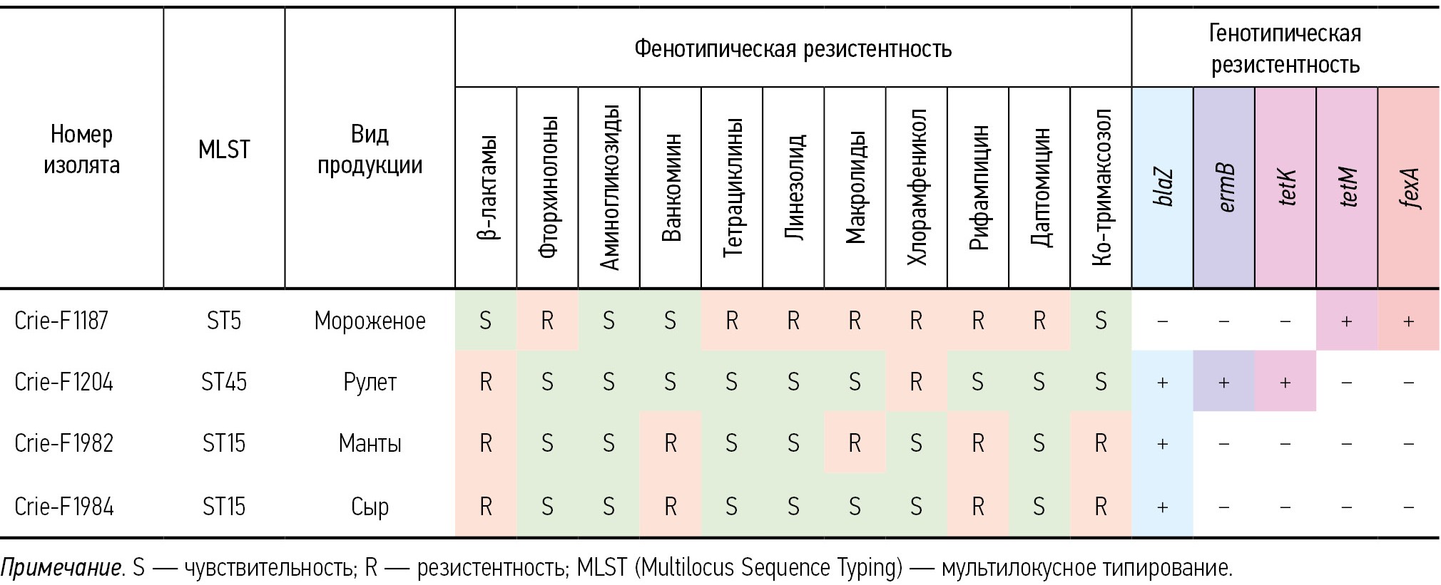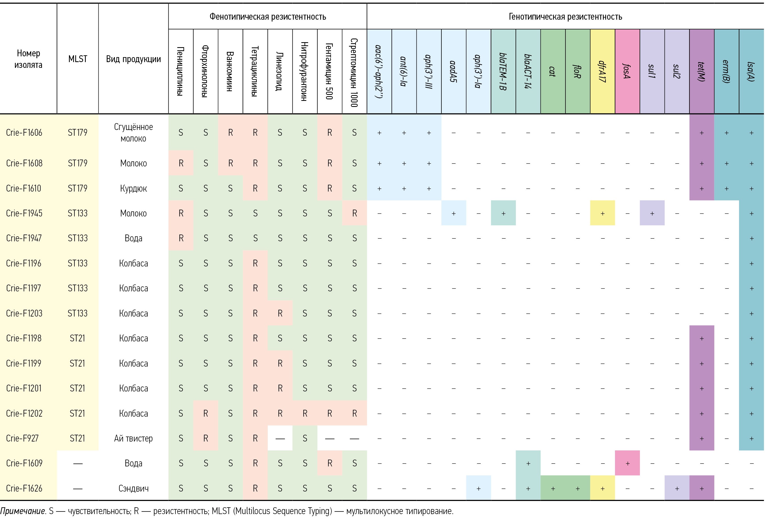 Профили чувствительности к противомикробным препаратам проводили методом микроразведений в бульоне Мюллера–Хинтона с определением минимальной подавляющей концентрации с помощью полуавтоматического бактериологического анализатора Sensititre® (TREK Diagnostics Systems, США) и Phoenix® M50 (Becton Dickinson, США). Инокуляцию изолятов микроорганизмов проводили c использованием 96-луночных микропланшетов с антибиотиками для грамположительных микроорганизмов GPALL1F и РMIC соответственно. Анализ результатов определения чувствительности изолятов микроорганизмов, выделенных из пищевых продуктов и продовольственного сырья, в отношении противомикробных препаратов на бактериологическом анализаторе Sensititre® (TREK Diagnostics Systems, США) проводили с помощью программного обеспечения SWIN® (Thermo Fisher Scientific Inc., США) до категории согласно стандарту интерпретации Европейского комитета по тестированию на чувствительность к противомикробным препаратам (EUCAST версии 10.0–13.0, 2020–2023 гг. соответственно). Контроль качества определения чувствительности выполняли на культурах S. aureus ATCC43300 и ATCC29213.