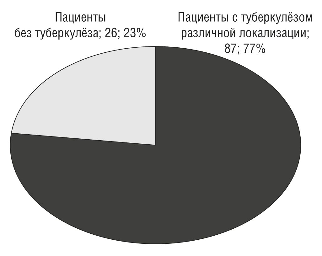 При анализе данных 113 больных основную группу составили пациенты с туберкулёзом различной локализации ― 87 (77%), из них 36 (41,4%) с лёгочным туберкулёзом, 45 (51,7%) с туберкулёзом множественной локализации, включая органы дыхания, 6 (6,9%) с внелёгочным туберкулёзом.