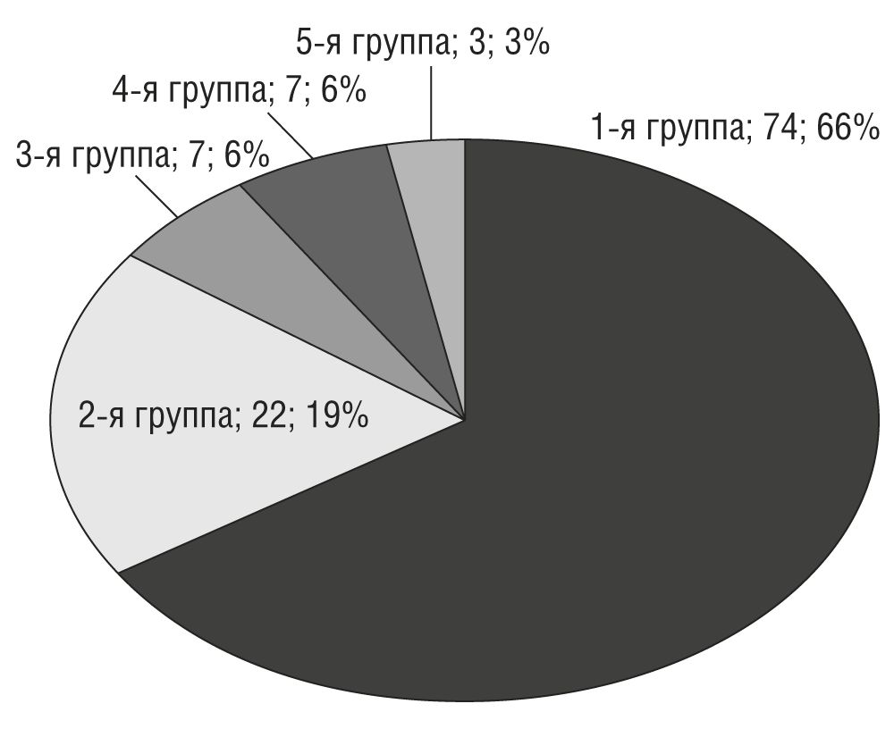 5) в 5-ю группу (3; 3%) ― пациенты, имевшие в анамнезе туберкулёз различной локализации, в том числе органов дыхания, без признаков активности на момент данного обследования (рис. 2).