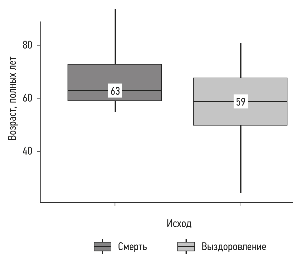Рис. Медиана возраста больных COVID-19 в зависимости от исхода заболевания.