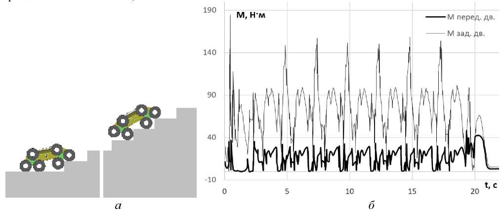 Рис. 8. Преодоление лестницы: а – моделирование подъема по лестнице; б – моменты на входе в бортовые редукторы движителей левого борта робота