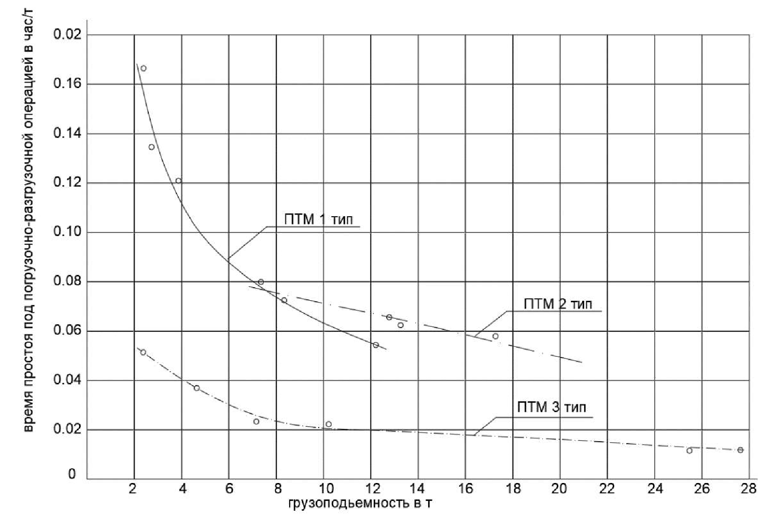 Производительность погрузочно-транспортных машин возрастает по мере увеличения грузоподъемности, до 6-7 т ‒ по закону гиперболы, а далее ‒ по закону прямой линии. Наиболее интенсивный рост производительности отмечается у погрузочно-транспортных машин третьего типа, затем ПТМ второго типа, а самый малый ‒ у одиночных ПТМ первого типа.