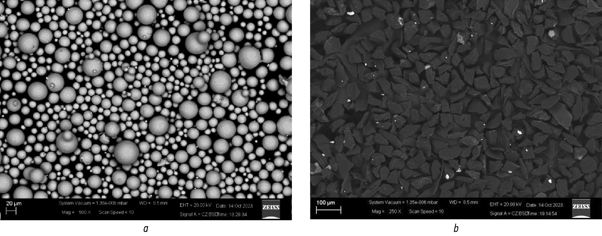 Рис. 1. Изображения компонентов порошковой смеси, полученные на электронном микроскопе: a сферический порошок ВТ-6; b керамические частицы B4C.