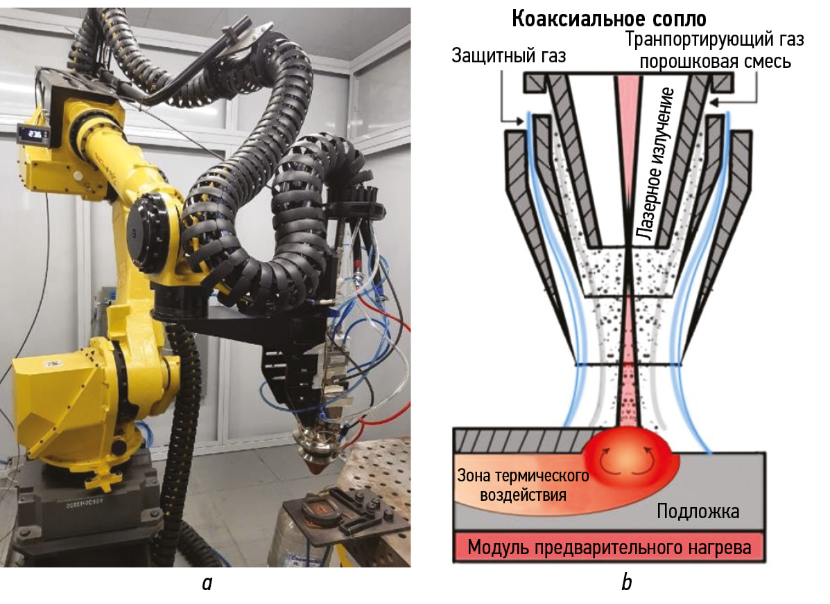 Рис. 2. Оборудование и принцип метода прямого лазерного выращивания: a комплекс для лазерной наплавки; b схема метода.
