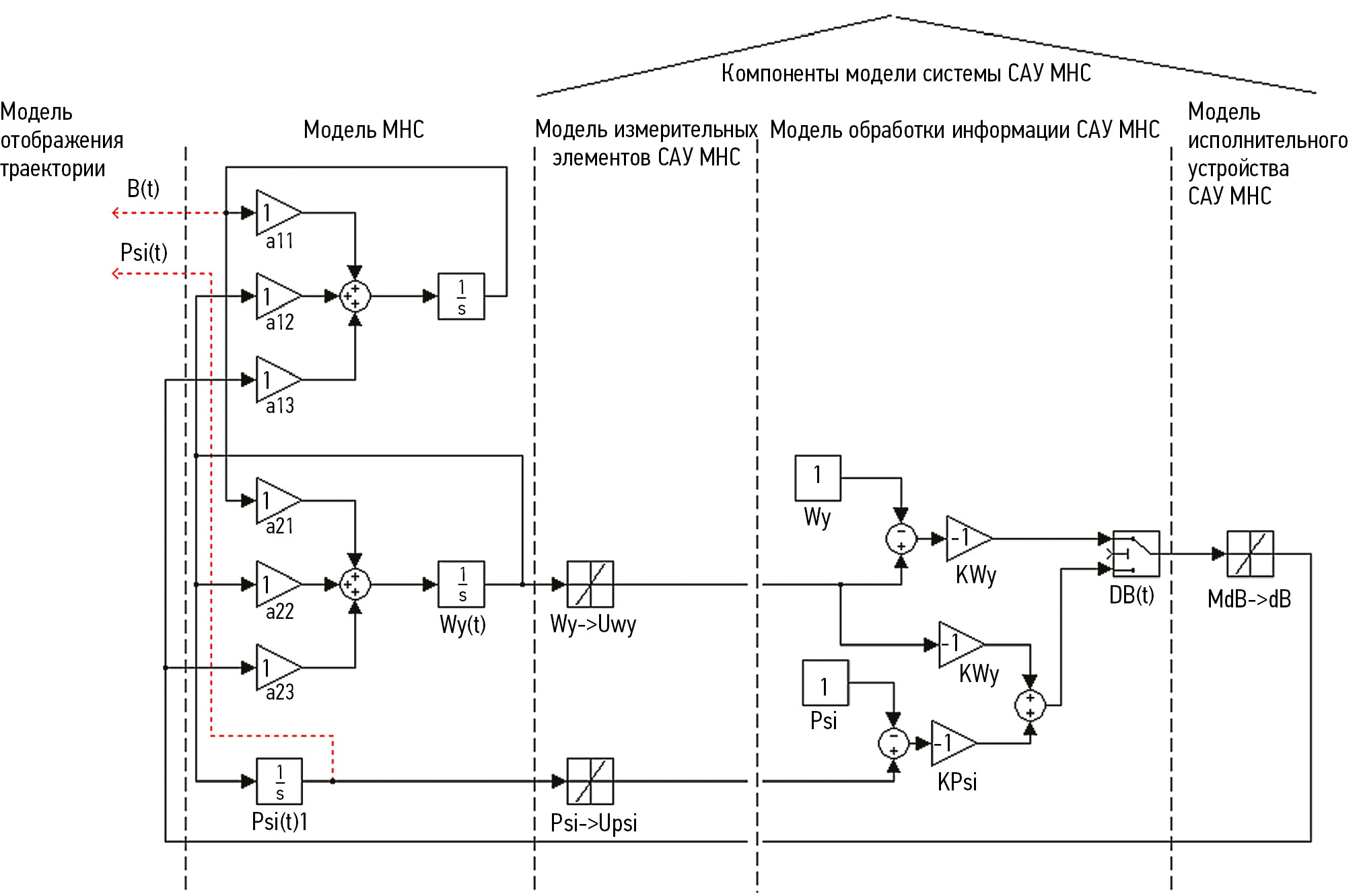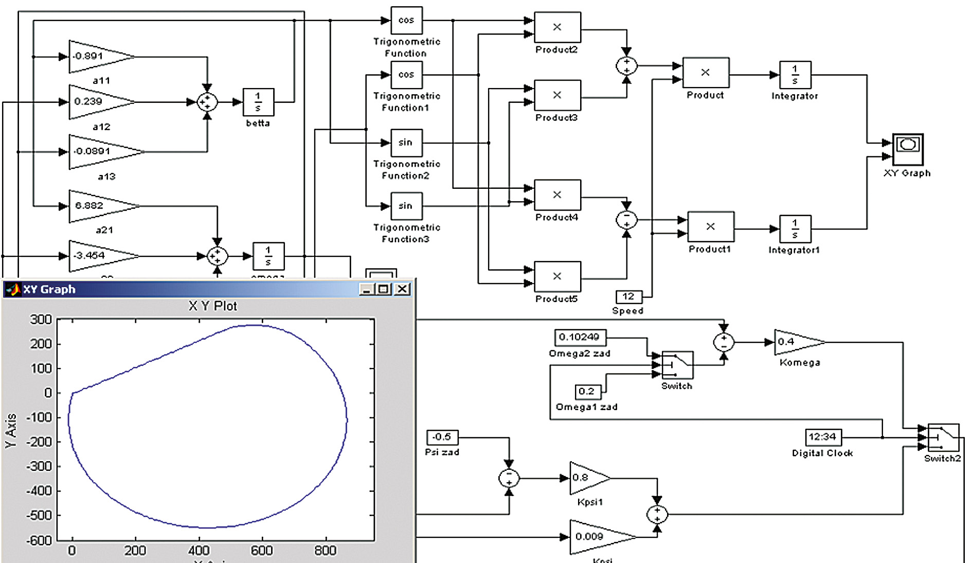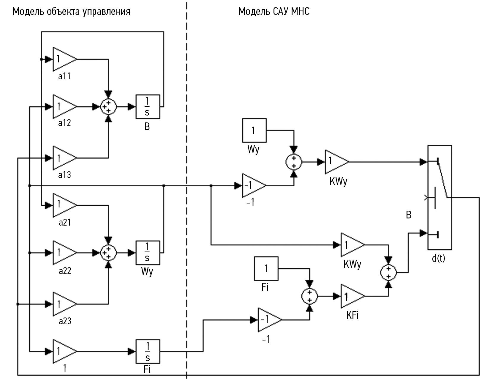 (t)dt=a11β+a12ωy(t)+a13δβ(t)y(t)dt=a21β+a22ωy(t)+a23δβ(t)dt=ωy(t)модель_обьекта_управленияδβ=δβmaxSIGN(Kψ(ψ(t)ψ)+Kωyωy(t))модель_системы_управления(t)dt=V(cos(β(t)cos(ψ(t))+sin(β(t))sin(ψ(t)))dt=V(cos(β(t))sin(ψ(t))+sin(β(t))cos(ψ(t)))модель_траектории_МНС