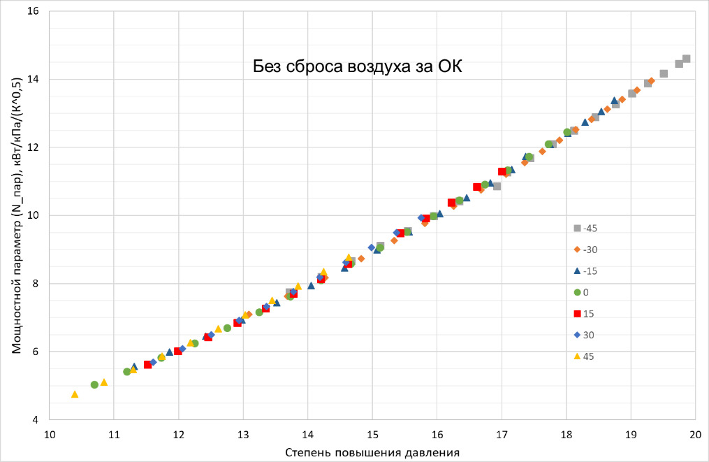 Как видно из рис. 6, несмотря на сильные отличия рассмотренных режимов (изменение режима работы, изменение КПД осевого компрессора), зависимость мощностного параметра от степени повышения давления в ОК для этих режимов с высокой точностью ложится на одну линию.