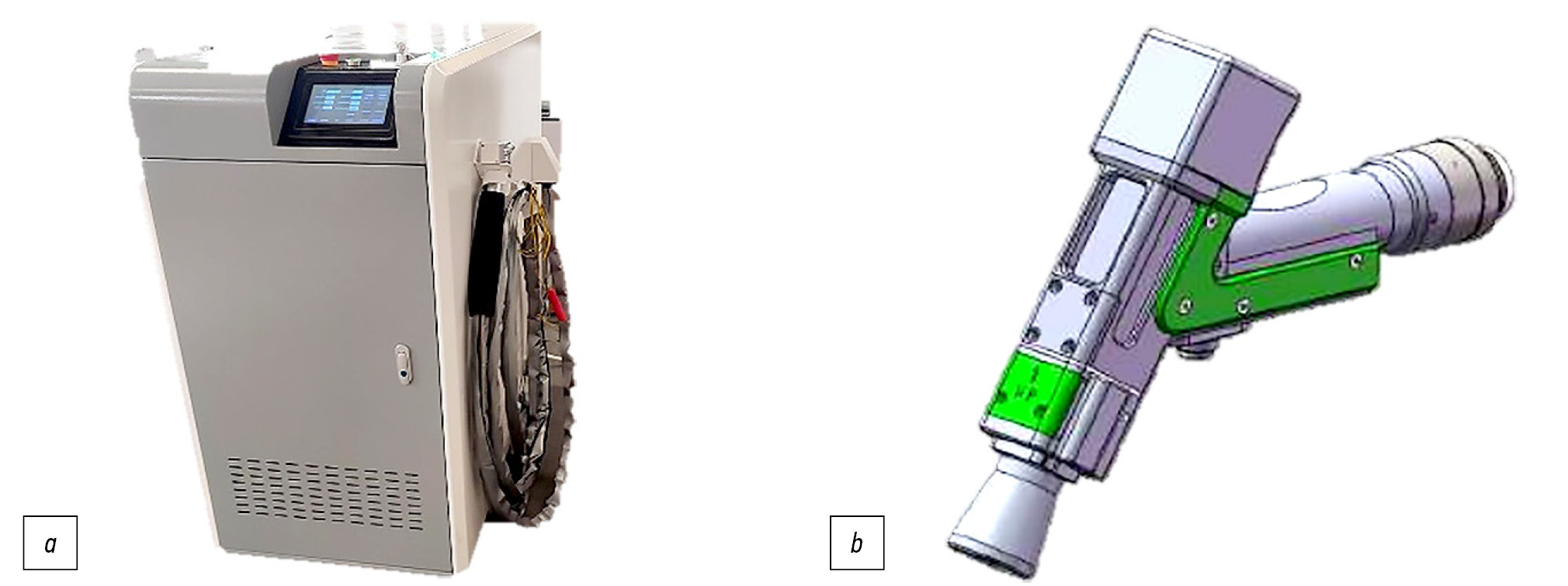 Рис. 2. Оборудование для чистки: а — аппарат Raptor SFW-3000R; b — лазерная головка RELFAR FWH20-S10A.