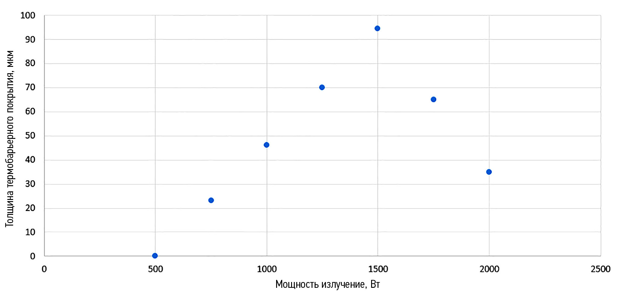 Рис. 10. Зависимость толщины термобарьерного покрытия от мощности.