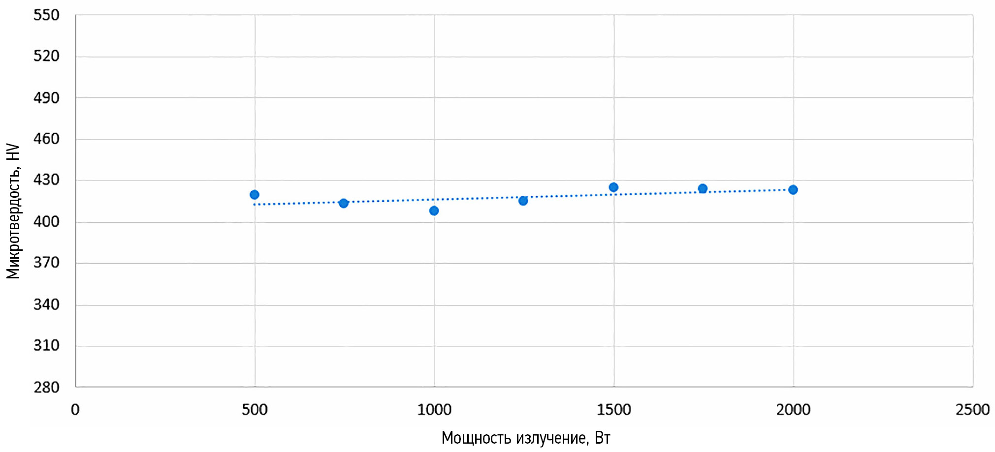 На рис. 11 показан график зависимости микротвердости от мощности. Начальное значение микротвердости поверхности — 402 HV.