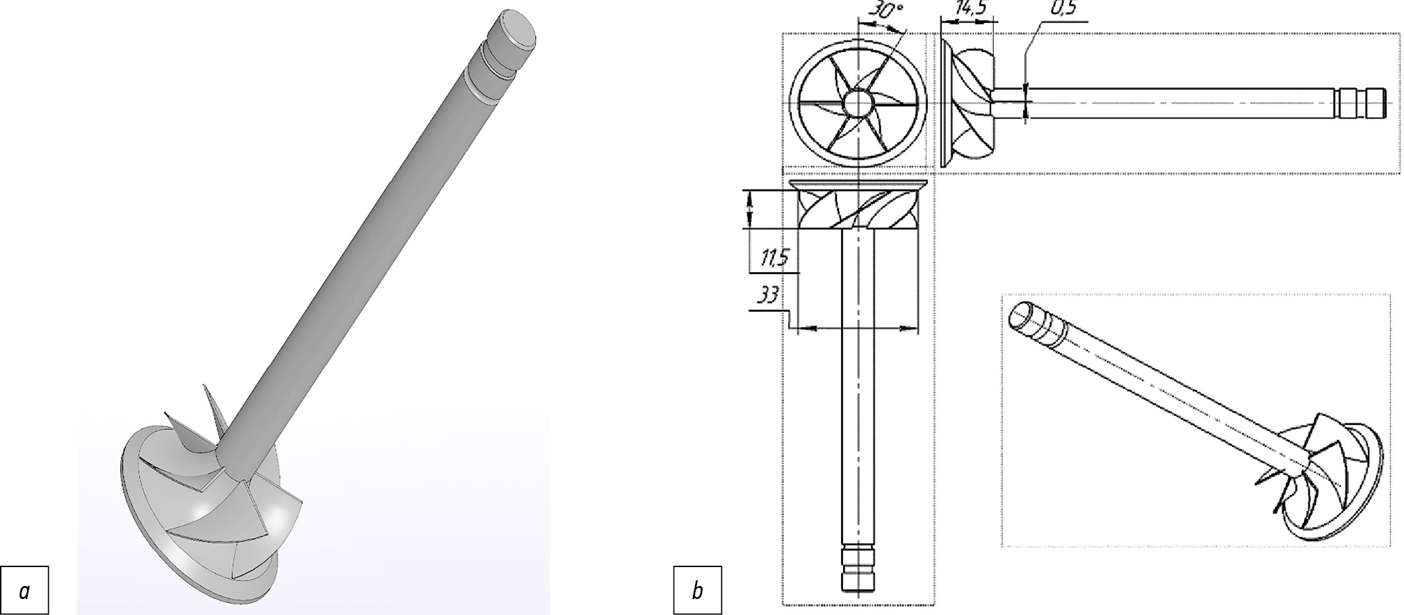 Рис. 1. Общий вид исследуемого клапана судового малоразмерного двигателя Ч8,5/11: а — представленный в 3D модели; b — основные размеры клапана [8].