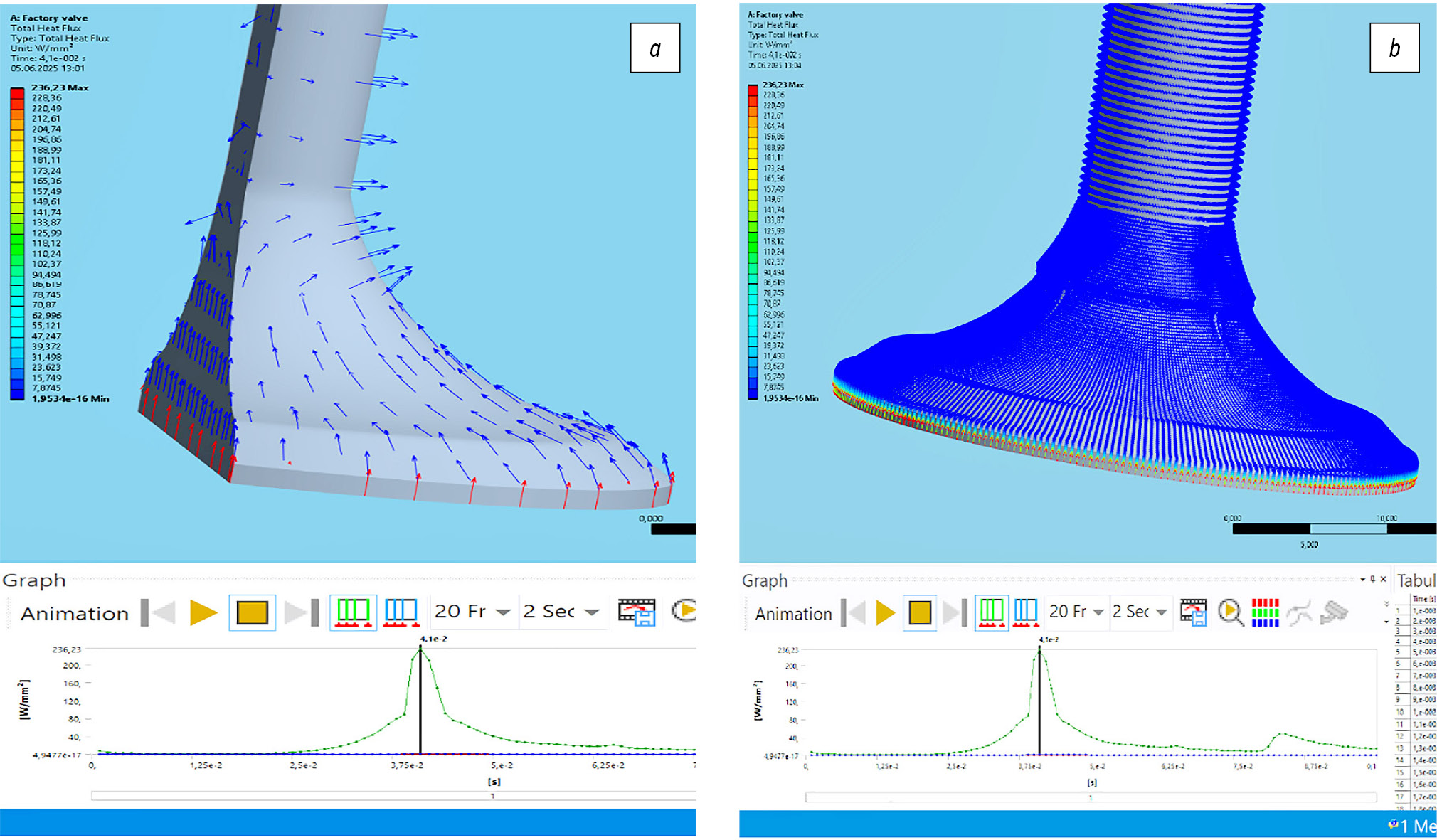 CONCLUSION: The simulation allowed to collect data on the temperature distribution inside valve trays of the studied 40X steel valves, which can be viewed at any time of the studied interval. The study of the heat flux in valves of different designs revealed that the heat flux increased in the valve with 3 blades (283.12 W/mm2) and the heat flux in the design with 6 blades was 281.49 W/mm2.