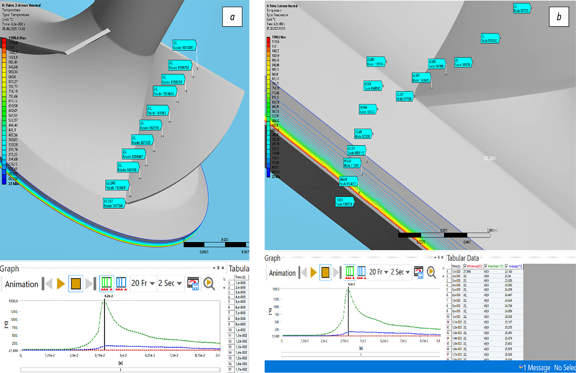 Рис. 10. Фрагмент распределения температуры внутрь тарелки клапана от 1590,6°С до 60°С, данное расстояние от max до min температуры = 1 мм (a); распределение Т от 60°С до 22°С, на расстоянии более 3 мм вглубь тарелки (b).