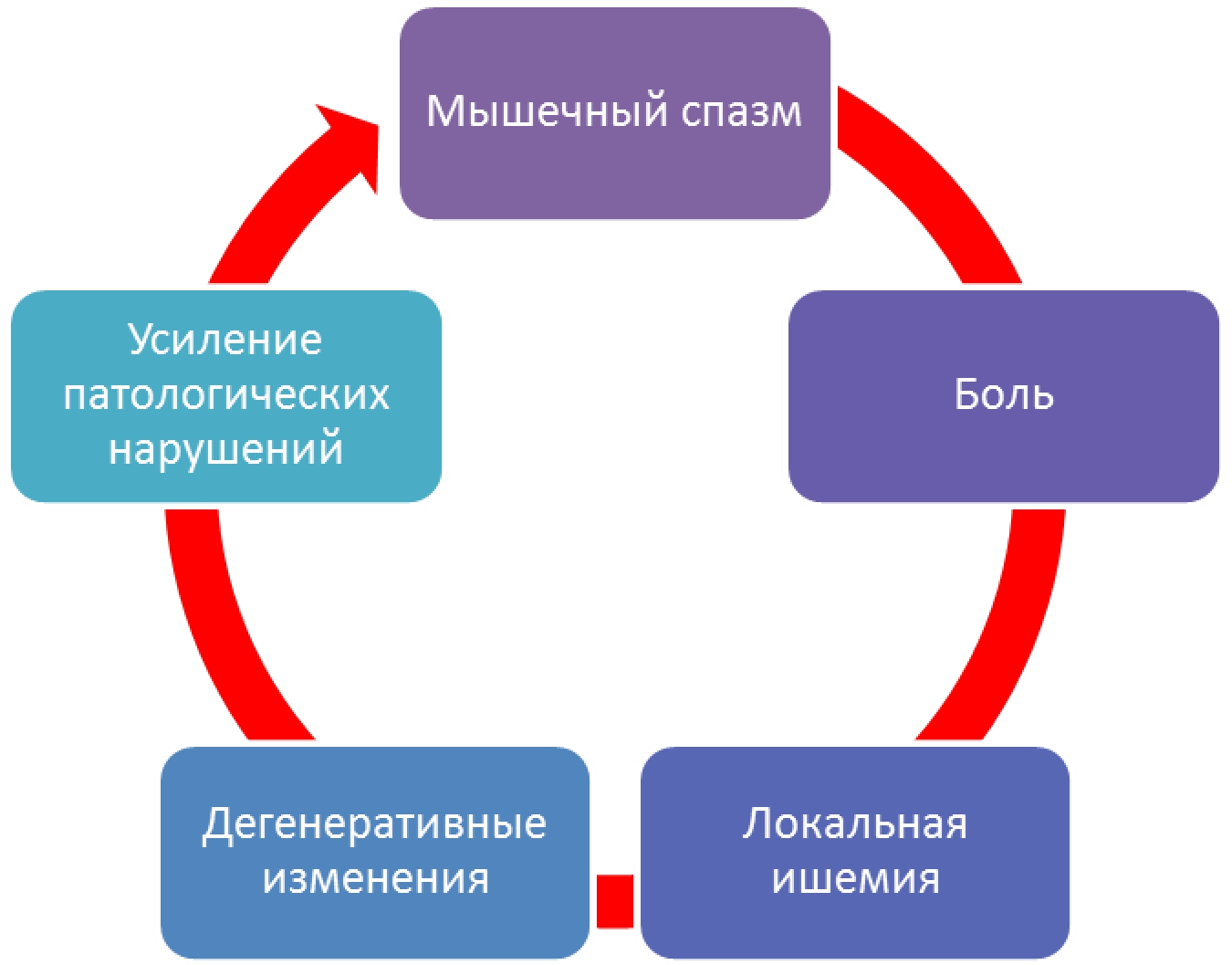 Боль является одной из самых распространенных жалоб на приеме врача-стоматолога [1]. Зачастую пациенты обращаются за стоматологической помощью при лечении кариеса и его осложнений. Однако при проведении полноценного осмотра может быть диагностирована и иная патология, например, миофасциальный болевой синдром, при котором боль является наиболее весомым компонентом спастичности жевательной мускулатуры [2]. Данная патология выявляется случайным образом, однако, при отсутствии терапии происходит первоочередная утрата тонких произвольных движений нижней челюсти, гиперрефлекция, мышечный гипертонус [3]. Развивается порочный круг: спазм – болевой потенциал – спазм – болевой потенциал [4]. Помимо этого, при гипертонусе жевательной мускулатуры наблюдается ишемия, вазогенный отек тканей, развитие микроциркуляторных нарушений. Порочный круг прогрессирует согласно рис. 1.