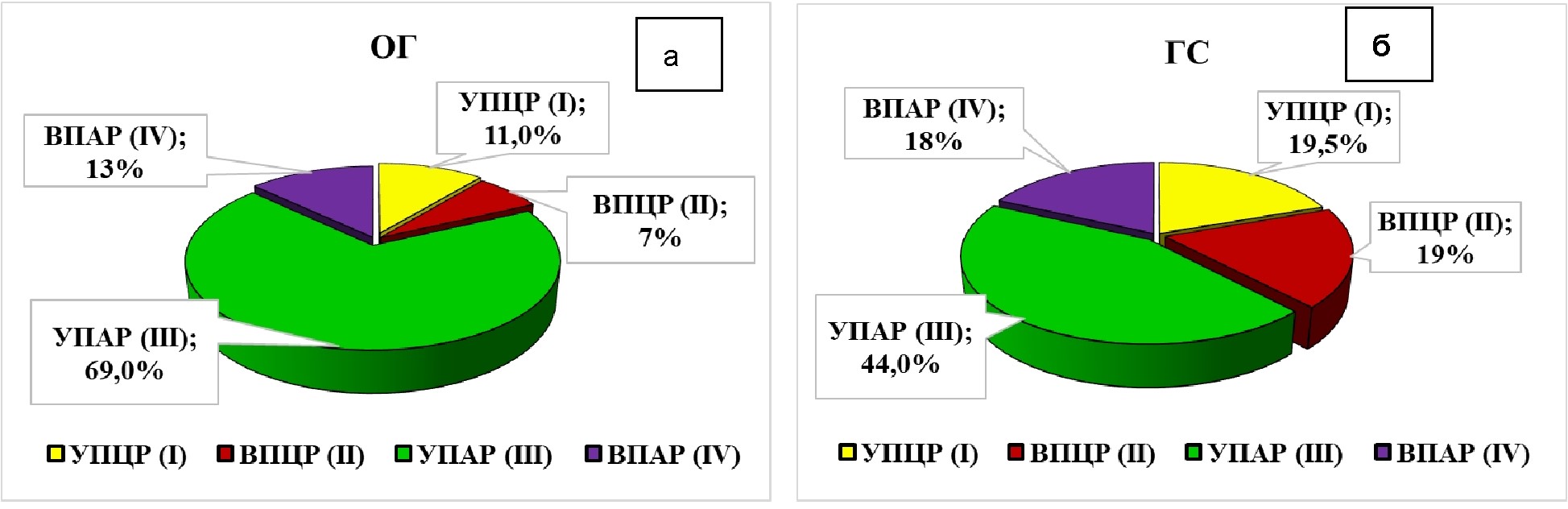 В начале исследования были определены ТВР: с умеренным преобладанием центральной регуляции УПЦР (I тип); выраженным преобладанием центральной регуляции ВПЦР (II тип); умеренным преобладанием автономной регуляции УПАР (III тип); выраженным преобладанием автономной регуляции ВПАР (IV тип) (Шлык Н. И., и др., 2012). В ОГ и ГС установлены на начальном этапе исследования ТВР: I ТВР в ОГ – 19,5 %, в ГС – 17,5 %; II ТВР: в ОГ – 19 %, в ГС – 19 %; III ТВР: в ОГ – 43,5 %, в ГС – 43,5 %; IV ТВР: в ОГ – 18 %, в ГС – 20 %.