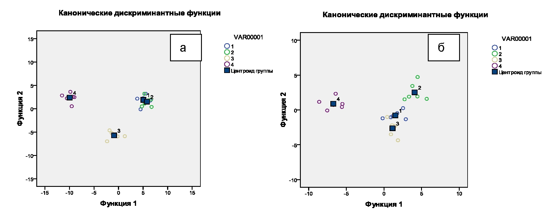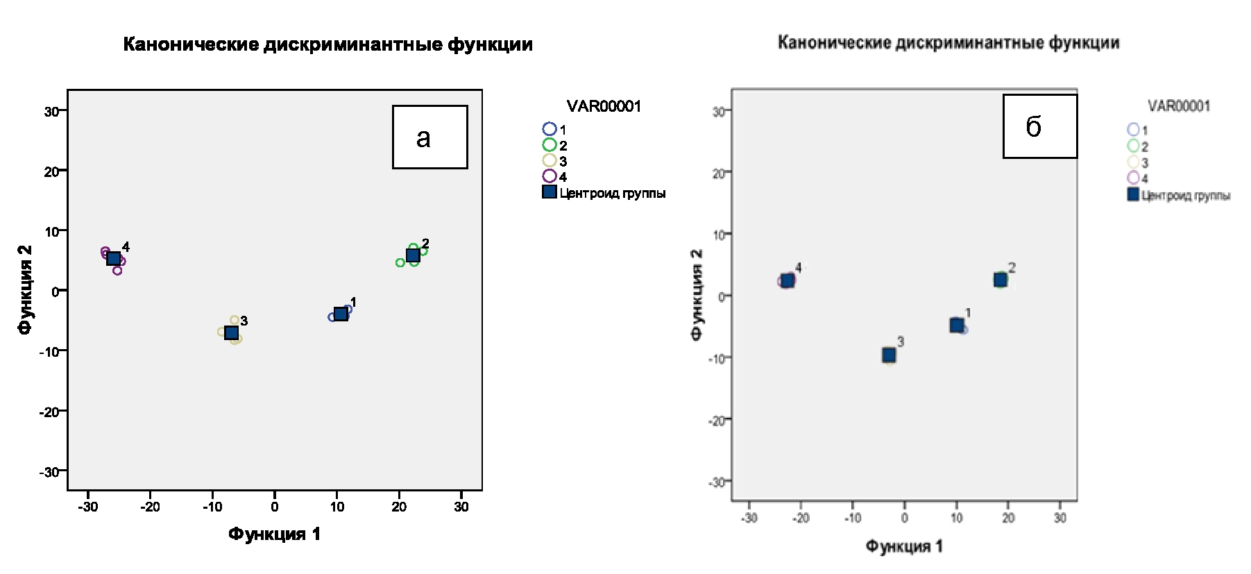 Рис. 2. Распределение центроидов групп по типам вегетативной регуляции на начальном этапе исследования в ОГ (а) и ГС (б)