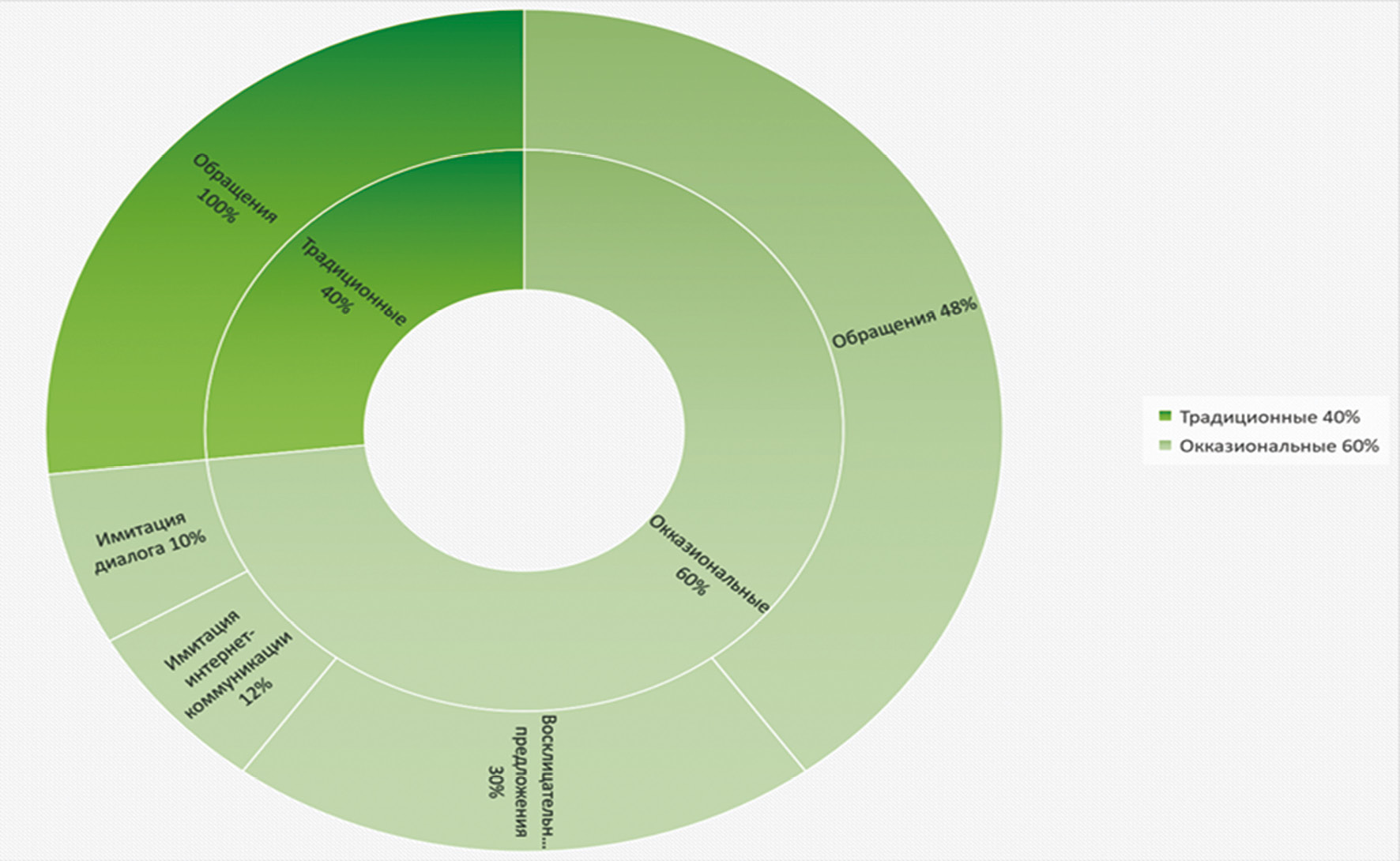 Среди структурных особенностей неформальной коммуникации в сфере фигурного катания превалируют обращения (48 %): «Саша, ты космос», «Камила, мы любим тебя». Менее частотны восклицательные предложения (30 %): «Андрей! Мы за тебя!», «Сделано!». Также встречается имитация диалога (10 %): «Лиза, выходи за меня», «А где Алина?»; имитация интернет-коммуникации вне интернет-дискурса (12 %), например «#СвояЗагитова», «#Русская ракета» и др. Процентное соотношение структурных особенностей представлено на диаграмме (рис. 1).