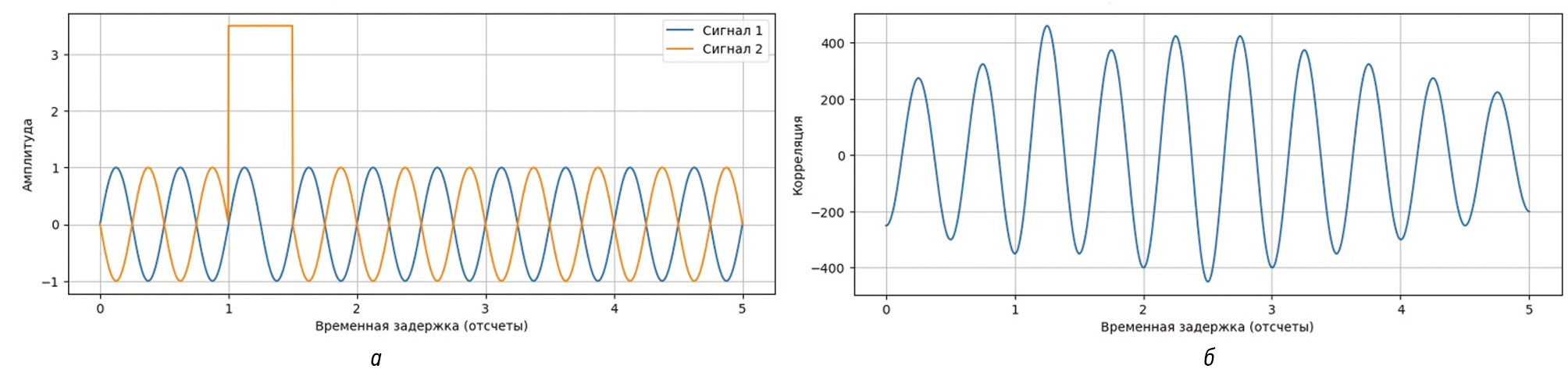 Рис. 1. а) Синусоидальные сигналы; б) График корреляции сигналов